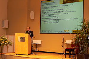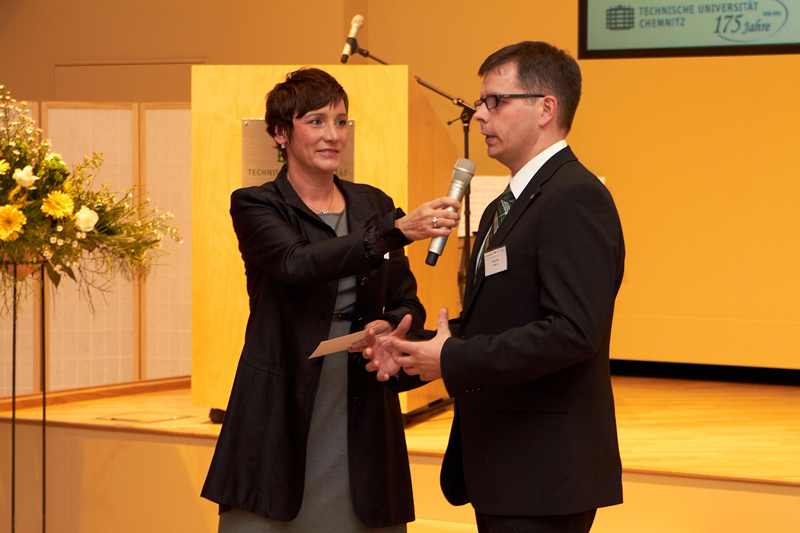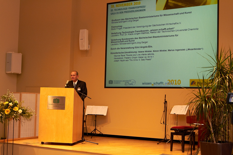 Der mit 20.000 Euro dotierte Technologie-Transferpreis ging an das Projekt "EpiCurve TT - Echtzeit-Prozesskontrolle für die globale LED-Industrie" der TU Magdeburg und der LayTec GmbH Berlin. Dr. Thomas Zettler , Geschäftsführer der LayTec GmbH nahm den Preis entgegen.