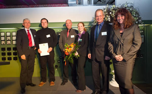 | Gewinner des Sonderpreises des Sächsischen Staatsministeriums für Wissenschaft und Kunst 2011: Leibniz-Institut für Festkörper- und Werkstoffforschung Dresden e.V. und ScIDre Scientific Instruments Dresden GmbH (v.l.) MR Christoph Zimmer-Conrad (SMWK), Robert Schöndube (ScIDre GmbH), Dr. Dirk Lindackers, Dr. Stefanie Hartmann (beide IFW Dresden), Dr. Rüdiger Schwitalla (ScIDre GmbH), Prof. Dr. Cornelia Zanger (TU Chemnitz) |