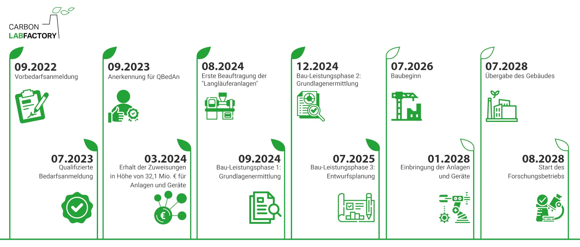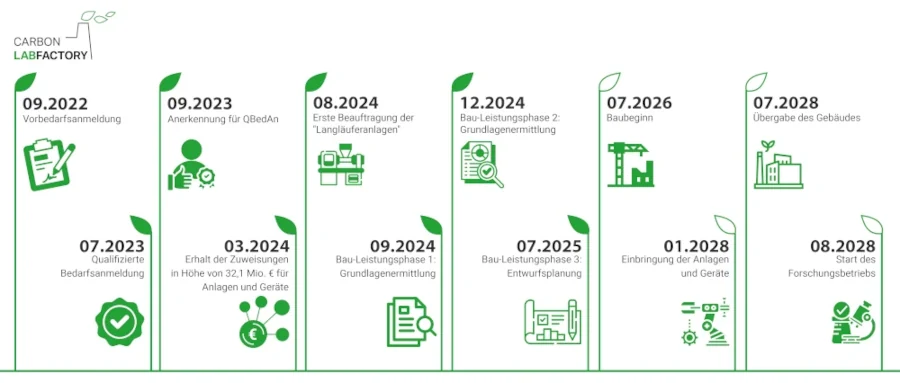 Gegenwärtig werden die Leistungsphase 4 und 5 parallel bearbeitet, so dass im Juni 2026 mit dem Baubeginn zu rechnen ist. Die Fertigstellung des Gebäudes ist für Ende 2027 geplant, anschließend kann mit der Ausstattung der Räume und Hallen mit den geplanten Geräten und Anlagentechnik begonnen werden, so dass die Forschungsarbeiten ab etwa Juli 2028 starten können.