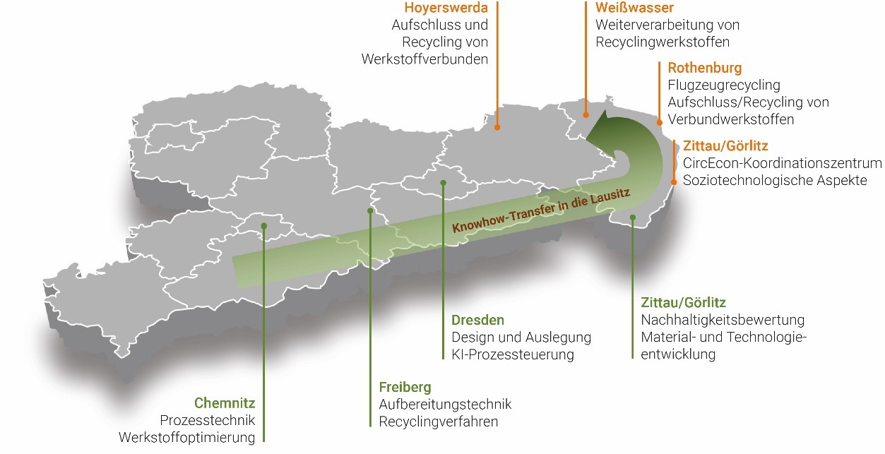Hierfür bündeln die drei sächsischen Universitäten aus Chemnitz, Dresden und Freiberg und die Hochschule Zittau/Görlitz ihre Kompetenzen, um einen gemeinsamen und europaweit einzigartigen Satelliten-Campus für Kreislaufwirtschaft in der Lausitz zu etablieren. Im Rahmen von CircEcon erfolgt die Akquirierung und Bearbeitung gemeinsamer grundlagen- und anwendungsorientierter Forschungsvorhaben sowie Industrieprojekte. Damit schließt das Konsortium zukünftig Bedarfslücken seitens der regionalen KMU und Großindustrie nach einem derartigen Forschungscampus und unterstützt den Transformationsprozess in denen vom Kohleausstieg stark betroffenen Regionen.