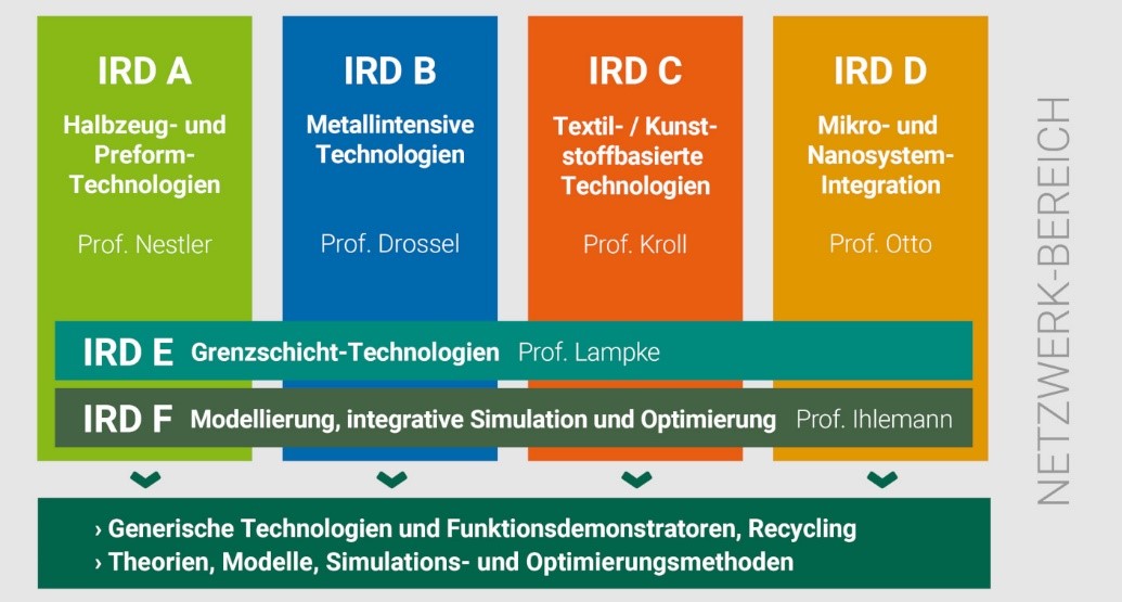 Über 100 Wissenschaftlerinnen und Wissenschaftler sowie Technikerinnen und Techniker aus insgesamt sechs interagierenden Forschungsbereichen (IRDs) forschten an der Technologiefusion zur Produktion multifunktionaler Leichtbaustrukturen für die Großserie.