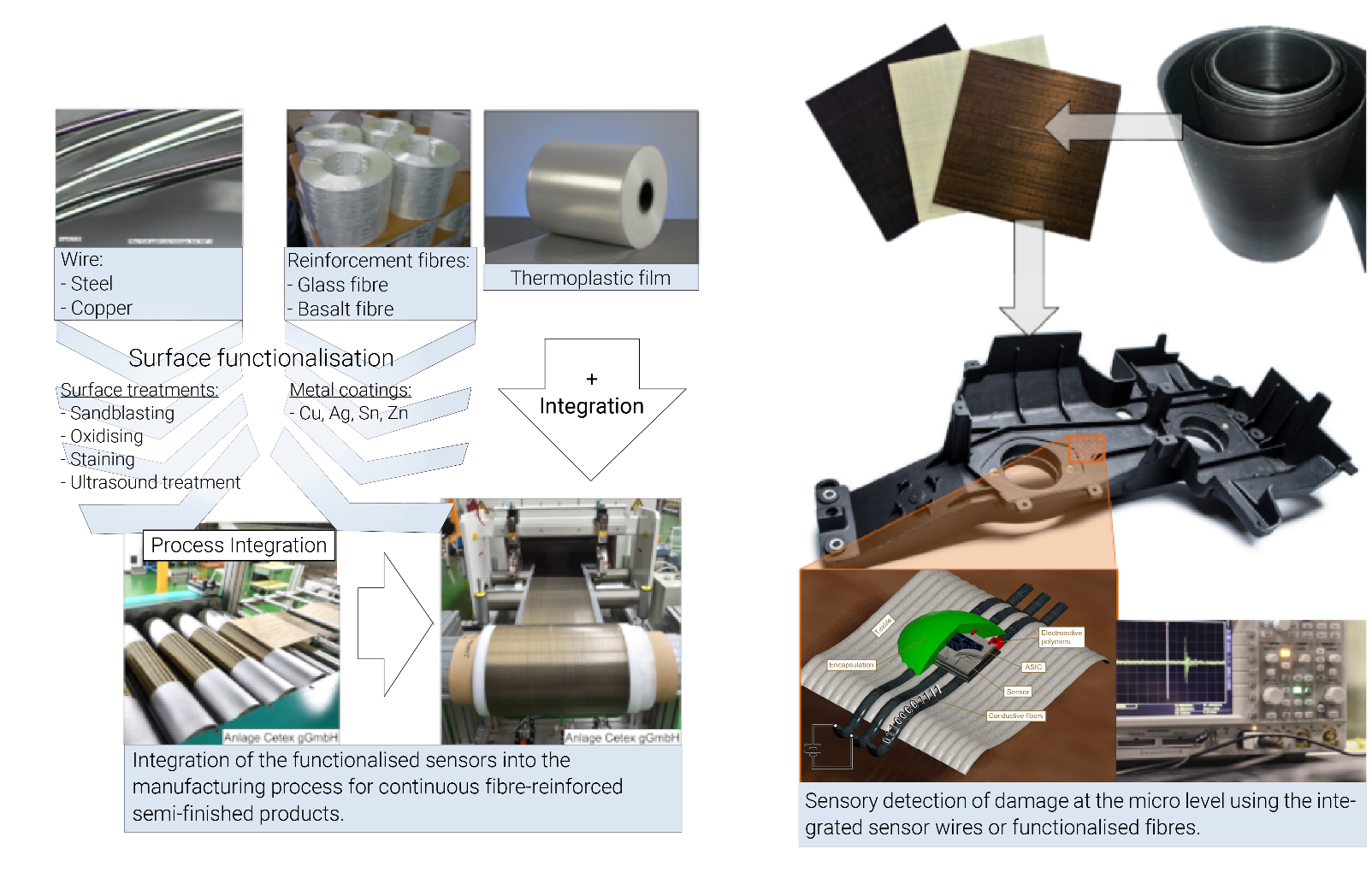 The aim of the project was the integration of component-specific sensor inserts (functionalised fibres and sensor wires) into continuous fibre-reinforced components for structural health monitoring and functionalisation. A sensor principle based on conductive metallic coatings for technical fibres was developed and implemented. The basis of the intended sensor system for structural health monitoring and functionalisation of fibre-plastic composites are the coated glass fibre rovings and sensor wires. The functionalised sensors make use of the inherent material properties, i.e. of the electrical conductivity of the sensor inserts. By measuring the electrical resistance, mechanical deformations can be detected and additional sensor functions integrated into the component.