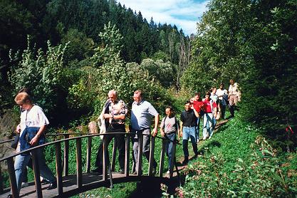 Nahe dem Bahnhof Scharfenstein, auf der anderen Straßenseite, finden wir den Wegweiser des Zschopautalweges in Richtung Wolkenstein. Diesen schönen Weg wandern wir ca. 2 km bis zu einer Holzbrücke, an der ein neuer, bachaufwärts führender Naturlehrpfad beginnt. Diesen gehen wir, bis er an einem Gehöft in einen Fahrweg mündet, den wir überqueren. Ein schöner Höhenweg führt, an den Kuranlagen von Warmbad vorbei, zur Hüttenmühle, wo wir eine Straße überqueren müssen. |