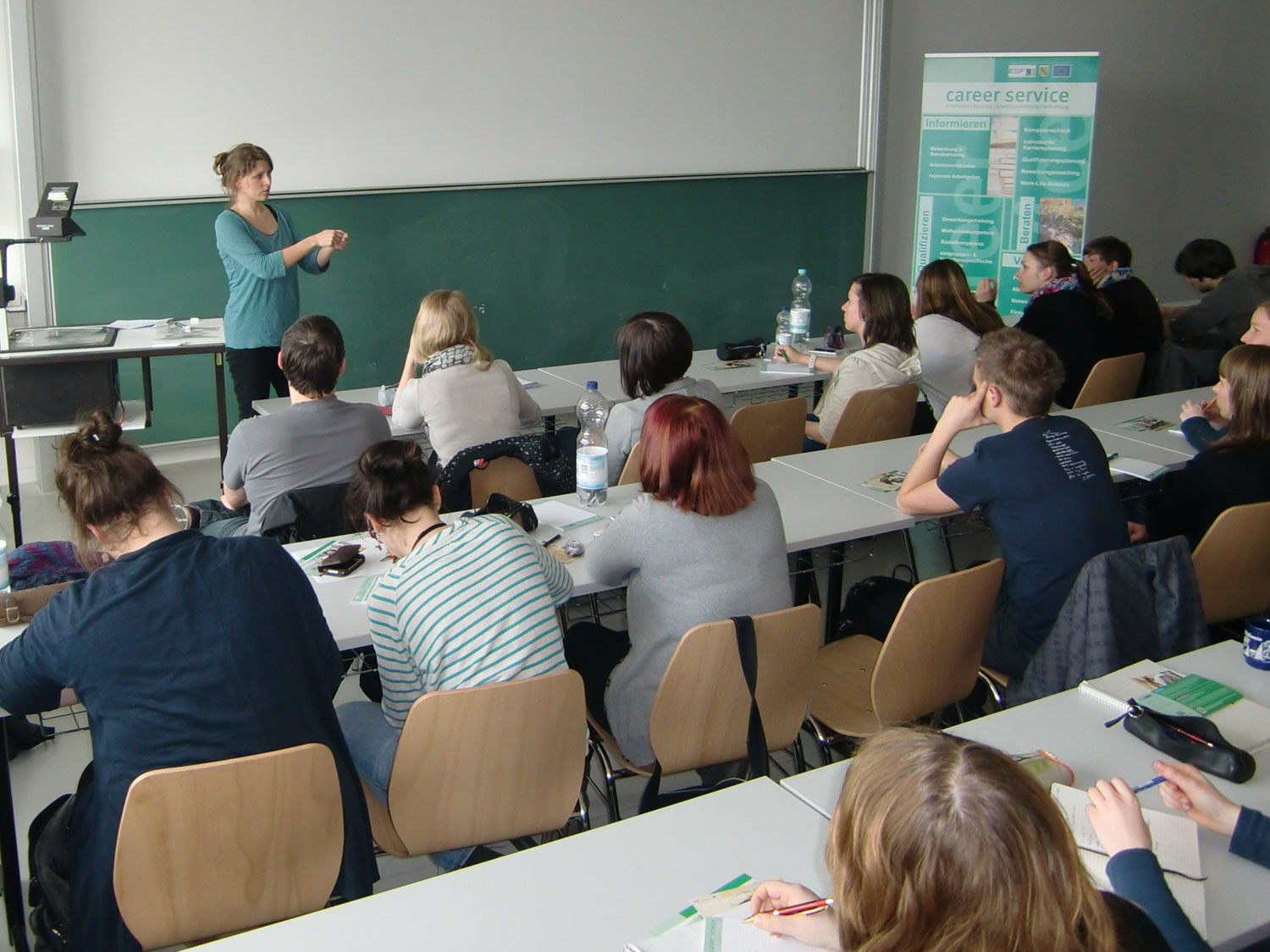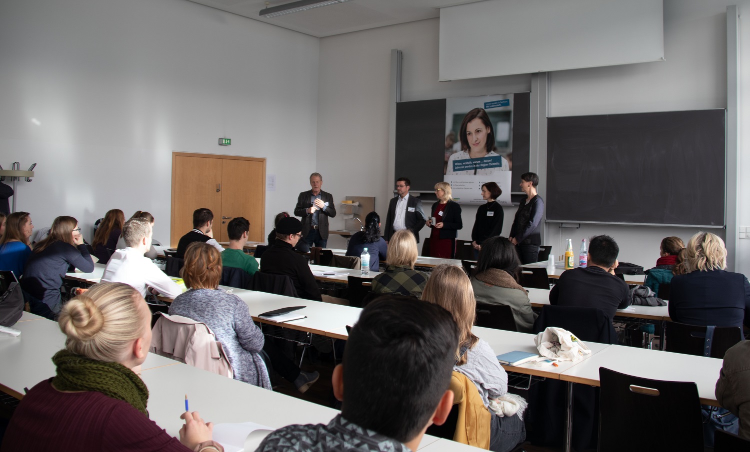An diesem Donnertag präsentierten sich sechs Bildungsträger (Forschungsinstitut Betriebliche Bildung, Freie Schulen Chemnitz, F+U Sachsen, Saxony International School Carl Hahn, Sächsischer Volkshochschulverband, Stadt Chemnitz) den anwesenden Studierenden und Absolventen als potenzielle Arbeits- und Praktikumseinrichtungen.
