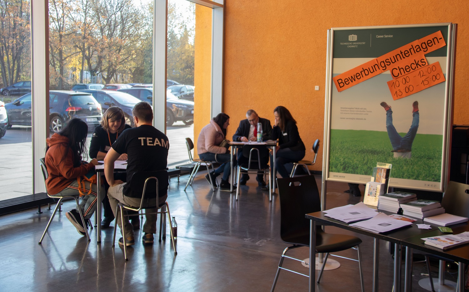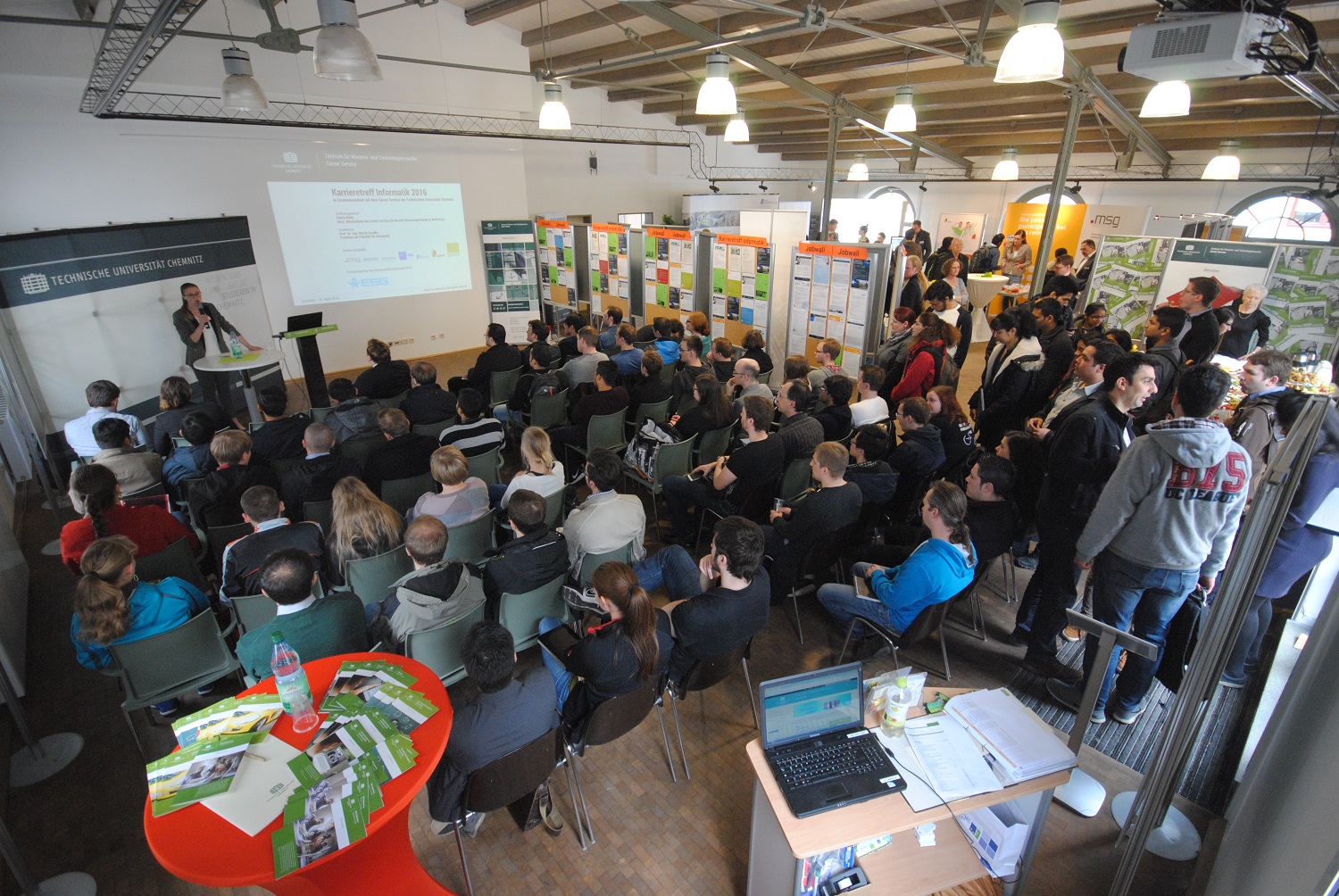 Zu unserem ersten Job- und Praktikatag stellten wir den Chemnitzer Studierenden direkt vor Ort - also im Neuen Hörsaalgebäude - jede Menge aktueller Stellenangebote unserer regionalen und überregionalen Partnerunternehmen vor. Welche Arbeitgeber darüber hinaus überhaupt in unserer Region zu finden sind, konnten alle Interessierten dank des reichlich vorhanden Informationsmaterials erfahren. Die Möglichkeit, die eigenen Bewerbungsunterlagen durchsehen zu lassen, wurde ebenfalls gern genutzt.