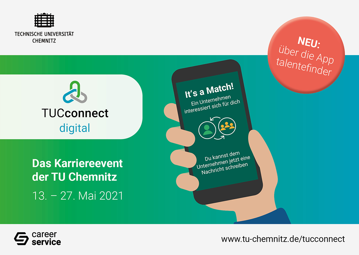 Am 27. Mai 2021 wurde unsere Karrieremesse TUCconnect das erste Mal in den virtuellen Raum verlagert. Wie jedes Jahr gab es die Möglichkeit, mit (über)regionalen Arbeitgebern aus verschiedenen Branchen ins Gespräch zu kommen – dieses Mal allerding nicht wie gewöhnlich im Zentralen Hörsaalgebäude der TUC, sondern online über die interaktive App „talentfinder“.