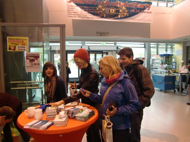 Mit dem neuen Workshopprogramm fürs Wintersemester 2010/11 unterm Arm waren wir am 12.10. zusammen mit Mitarbeitern des Gründernetzwerks SAXEED im Foyer der Mensa (Reichenhainer Straße) unterwegs. Neben vielen neuen Workshopangeboten überzeugten wir mit Karriere- und Work-Life-Balance-Beratung, die ebenfalls auf großen Zuspruch unter den zahlreichen Studierenden stieß. Wir konnten uns davon überzeugen, dass der Career Service bereits von einer großen Zahl Studierender als kompetenter Ansprechpartner für einen erfolgreichen Berufsstart wahrgenommen wird.Darüber hinaus informierten wir auch Erstsemester, beantworteten ihre Fragen zum aktuellen Workshopprogramm, machten Appetit auf unsere Vermittlung von Praktika und Stellenangeboten und luden zum Bewerbungsunterlagencheck ein.