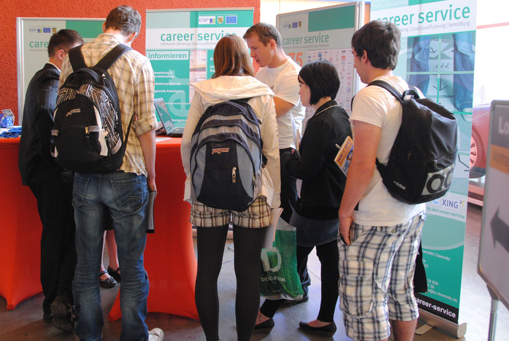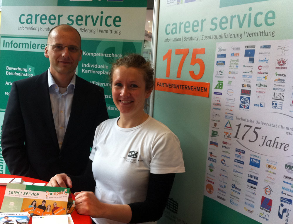 Am Messetag selbst waren wir mit einem Stand vor Ort vertreten: Wir gingen auf Unternehmen zu, um sie als Kooperationspartner zu gewinnen; beantworteten Fragen zu den Leistungen des Career Service, halfen Studierenden bei der Orientierung im Praktikums- und Jobdschungel und führten Bewerbungsunterlagen-Checks durch.