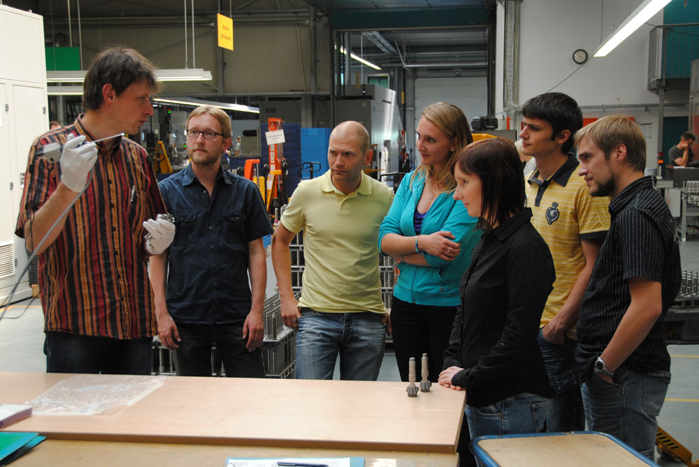 Nach einer vom Industriemeister Herr Conrad geführten Werksbesichtigung standen uns die kaufmännische Leiterin Frau Preißler, Herr Ronneburger (Leiter technische Planung) sowie Herr Sünderhauf (stellv. Konstruktionsleiter) - beide Absolventen der TU Chemnitz - Rede und Antwort. Dabei beantworteten sie nicht nur spezielle Fragen zum Unternehmen - sie gaben den Studierenden auch allgemeine Tipps zu den Anforderungen des Arbeitsmarktes.