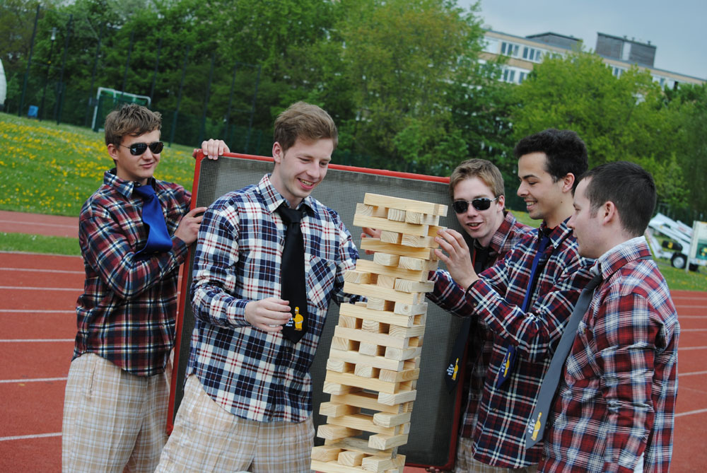 Wie im vergangenen Jahr waren wir auch diesmal auf dem Campus- und Sportfest vertreten. Aufgrund des fortgeschrittenen Alters der Beteiligten sahen wir allerdings von einer aktiven sportlichen Beteiligung ab und konzentrierten uns auf zwei wesentliche Aufgaben: Während sich im Foyer der Mensa Interessierte über unsere Angebote und Leistungen informieren konnten, betreute ein anderer Teil unseres Teams auf dem Sportplatz die Spielstation „Jenga XXL“. Vorgesehen war eigentlich - aus jubiläumszahltechnischen Gründen - eine Höchstpunktzahl von 175 - diese wurde jedoch bereits vom ersten Team deutlich übertroffen.