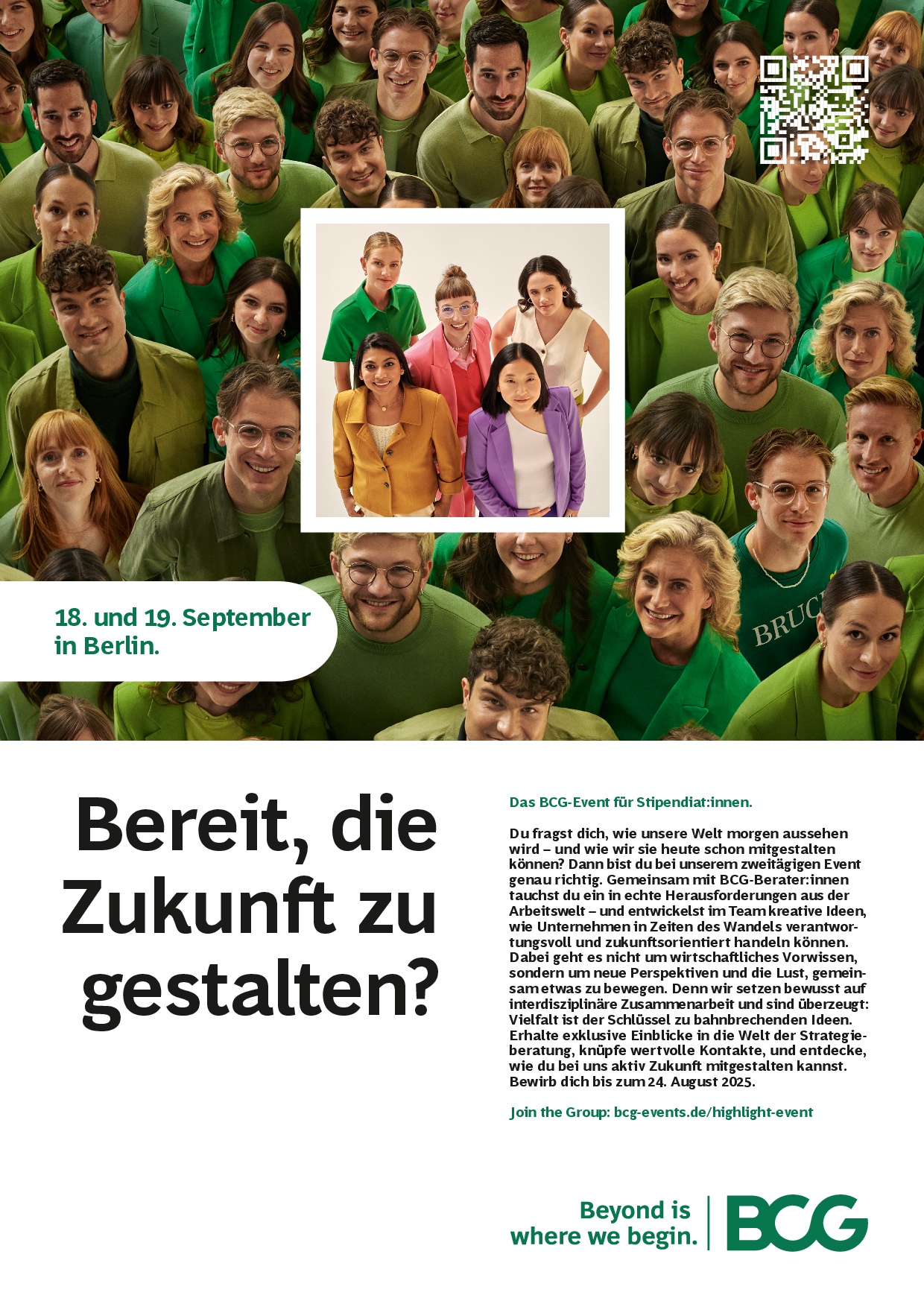- Kurzzusammenfassung: Du fragst dich, wie unsere Welt morgen aussehen wird – und wie wir sie heute schon mitgestalten können? Dann bist du bei unserem zweitägigen Event genau richtig. Gemeinsam mit BCG-Berater:innen tauchst du in echte Herausforderungen aus der Arbeitswelt ein – und entwickelst im Team kreative Ideen, wie Unternehmen in Zeiten des Wandels verantwortungsvoll und zukunftsorientiert handeln können. Dabei geht es nicht um dein wirtschaftliches Vorwissen, sondern um neue Perspektiven und die Lust, gemeinsam etwas zu bewegen. Denn wir setzen bewusst auf interdisziplinäre Zusammenarbeit und sind überzeugt: Vielfalt ist der Schlüssel zu bahnbrechenden Ideen. Erhalte exklusive Einblicke in die Welt der Strategieberatung, knüpfe wertvolle Kontakte und entdecke, wie du bei uns aktiv Zukunft mitgestalten kannst. Klingt spannend? Dann bewirb dich bis zum 24. August 2025 mit deinem CV (inklusive Notenangaben für Abitur und Studium).