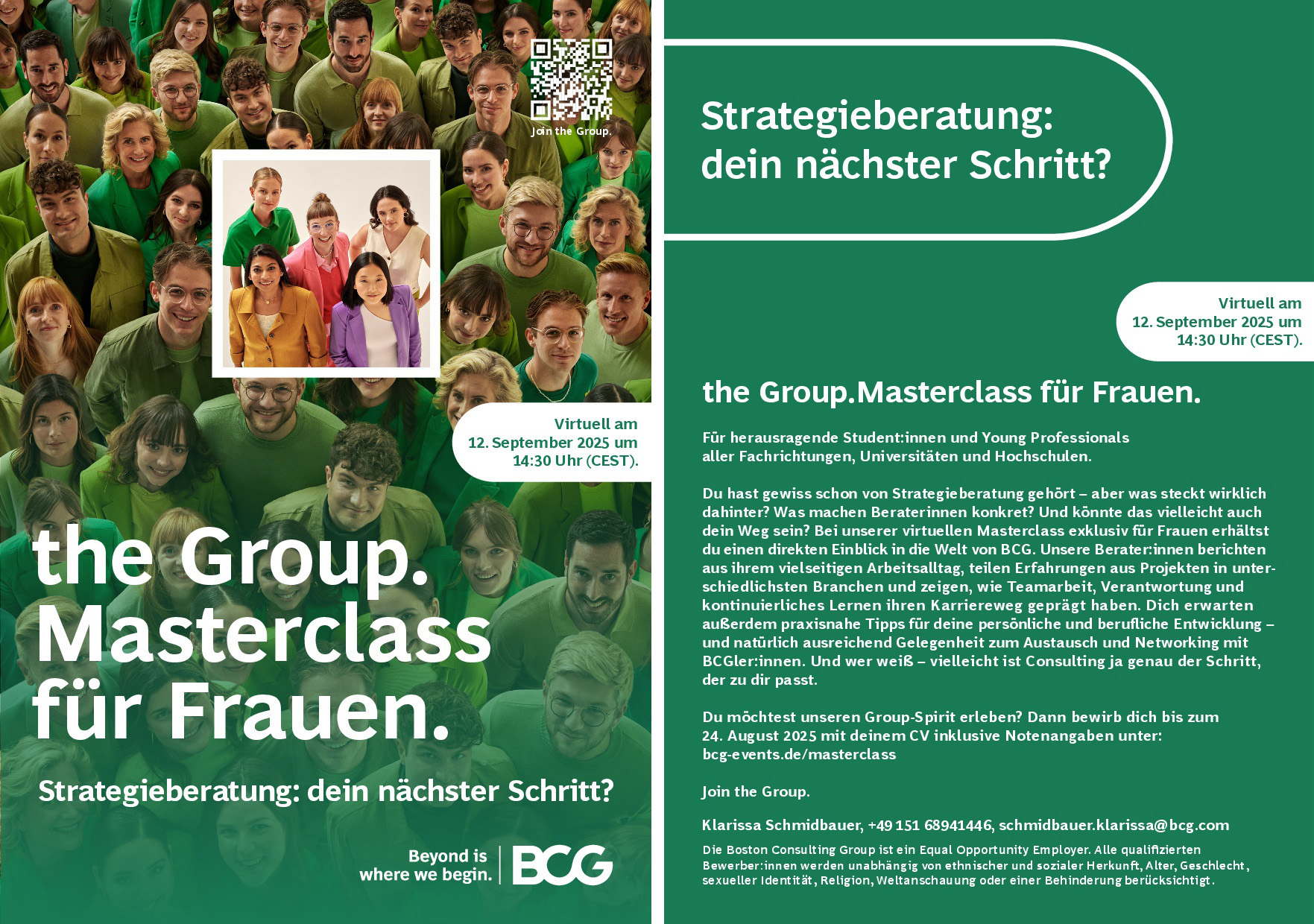 - Kurzzusammenfassung: Du hast gewiss schon von Strategieberatung gehört – aber was steckt wirklich dahinter? Was machen Beraterinnen konkret? Und könnte das vielleicht auch dein Weg sein? Bei unserer virtuellen Masterclass exklusiv für Frauen erhältst du einen direkten Einblick in die Welt von BCG. Unsere Berater:innen berichten aus ihrem vielseitigen Arbeitsalltag, teilen Erfahrungen aus Projekten in unterschiedlichsten Branchen und zeigen, wie Teamarbeit, Verantwortung und kontinuierliches Lernen ihren Karriereweg geprägt haben. Dich erwarten außerdem praxisnahe Tipps für deine persönliche und berufliche Entwicklung – und natürlich ausreichend Gelegenheit zum Austausch und Networking mit BCGler:innen. Und wer weiß – vielleicht ist Consulting ja genau der Schritt, der zu dir passt.