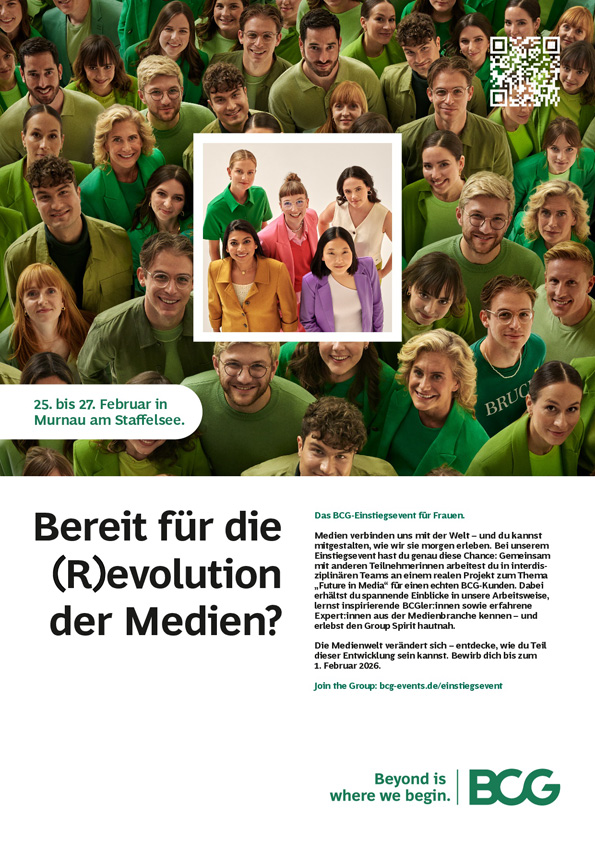 - Kurzzusammenfassung: Medien verbinden uns mit der Welt – und du kannst mitgestalten, wie wir sie morgen erleben. Bei unserem Einstiegsevent hast du genau diese Chance: Gemeinsam mit anderen Teilnehmerinnen arbeitest du in interdisziplinären Teams an einem realen Case zum Thema „Future in Media“ für einen echten BCG-Kunden. Dabei erhältst du spannende Einblicke in unsere Arbeitsweise, lernst inspirierende BCGler:innen sowie erfahrene Expert:innen aus der Medienbranche kennen – und erlebst den Group-Spirit hautnah. Die Medienwelt verändert sich – entdecke, wie du Teil dieser Entwicklung sein kannst. Bewirb dich bis zum 1. Februar 2026.