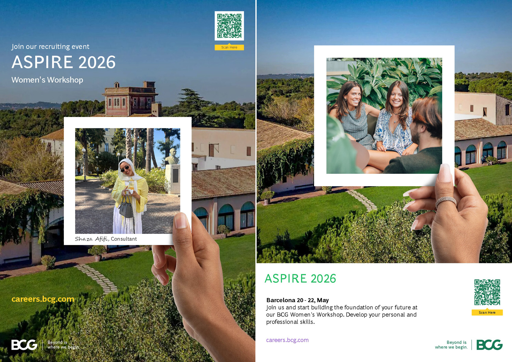- Kurzzusammenfassung: Werde Teil unseres BCG ASPIRE Women's Workshop und erhalte einen exklusiven Einblick in das, was dich als Beraterin bei einer der weltweit führenden Strategieberatungen erwartet. Zusammen mit über 90 herausragenden Teilnehmerinnen sowie erfahrenen BCG-Berater:innen hast du die Möglichkeit, wertvolle Kontakte zu knüpfen und den Grundstein für deine Zukunft zu legen. Entwickle deine persönlichen und beruflichen Fähigkeiten weiter, tausche dich mit anderen talentierten Frauen aus und entdecke, welche spannenden Perspektiven BCG dir bietet.