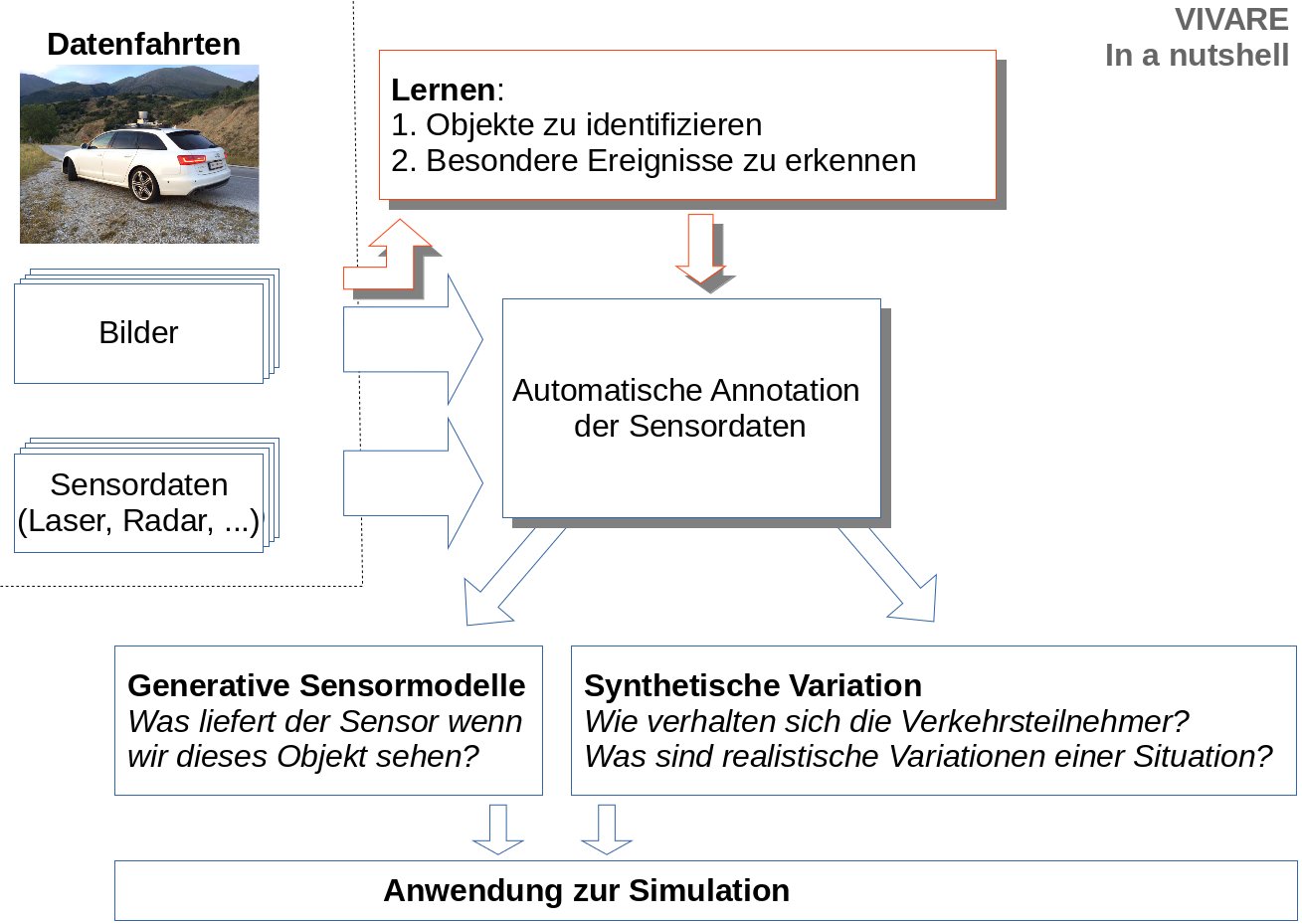 Vivare ist ein Kooperationsprojekt zwischen der TU Chemnitz und der Intenta GmbH. Die Kernfrage dieses Projekts lautet: Wie kann die korrekte Funktionsweise dieser Systeme sichergestellt werden? Die gängige Praxis der Automobilhersteller besteht darin, diese sogenannte Absicherung mit Hilfe von Testfahrten durchzuführen. Allerdings steigt der notwendige Umfang und Aufwand für die Testfahrten mit zunehmender Komplexität der Automatisierung. Daher ist es naheliegend, Computersimulationen anstelle von realen Testfahrten zu verwenden ("Virtuelle Absicherung"), in denen kritische Ereignisse beliebig oft und reproduzierbar erzeugt werden können.