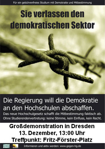 Am 13.12.2007 wird zu diesem Thema eine Demonstration in Dresden stattfinden. Wenn auch Du zum Ausdruck bringen willst, daß Du mit den geplanten Änderungen nicht einverstanden bist, dann beteilige dich!