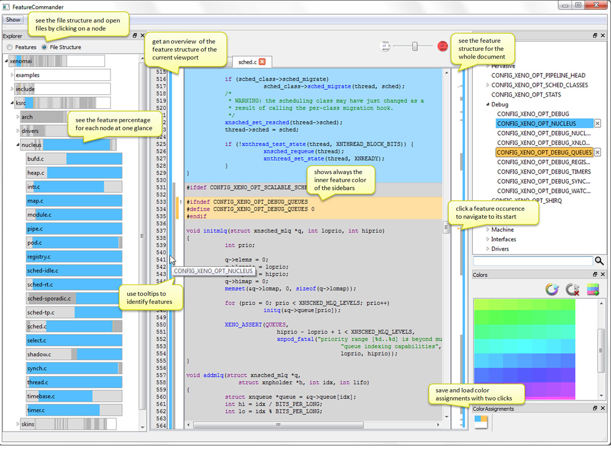 Feature Commander is a prototype for a software product line IDE. Its aim is to support programmers of software product lines by improving the usability of the development tool. The basic concept of Feature Commander is to process the preprocessor-based feature-assignments in the code (e.g. #ifdef or #endif statements) and display this information in other visual representations. For each feature, the user can easily assign a color, which is used throughout all visualizations. When a Feature has no assigned color, it is displayed with a shade of gray. This shows the Feature exists, but it does not get the users attention. There are three views: the Code View, the Explorer View and the Feature Model View. Each view helps the user in finding feature-based files or code fragments or getting a better understanding of the code.