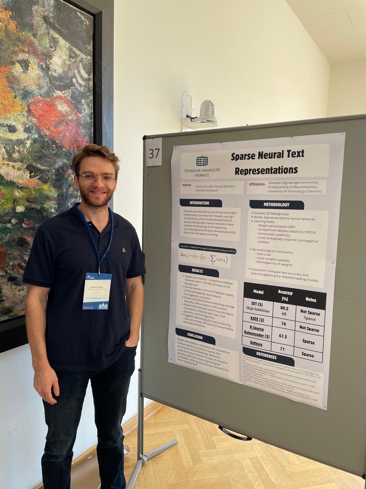 Our poster "Weight Perturbation and Competitive Hebbian Plasticity for Sparse Text Representations" was presented by Patrick at the Bernstein Conference 2025.