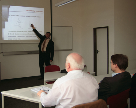 Abstract: Among the presently known numerical solvers of integral equations, two main categories of approaches can be traced: mesh-free approaches, mesh-based approaches. We will propose some techniques to process geometric data so that they can be efficiently used in subsequent numerical treatments of integral equations. In order to prepare geometric information so that the above two approaches can be automatically applied, we need the following items: (1) Splitting a given surface into several four-sided patches, (2) Generating a diffeomorphism from the unit square to a foursided patch, (3) Generating a mesh M on a given surface, (4) Patching of a given triangulation. In order to have a splitting, we need to approximate the surfaces first by polygonal regions. We use afterwards quadrangulation techniques by removing quadrilaterals repeatedly. We will generate the diffeomorphisms by means of transfinite interpolations of Coons and Gordon types. The generation of a mesh M from a piecewise Riemannian surface will use some generalized Delaunay techniques in which the mesh size will be determined with the help of the Laplace-Beltrami operator. We will describe our experiences with the IGES format because of two reasons. First, most of our implementations have been done with it. Next, some of the proposed methodologies assume that the curve and surface representations are similar to those of IGES. Patching a mesh consists in approximating or interpolating it by a set of practical surfaces such as B-spline patches. That approach proves useful when we want to utilize a mesh-free integral equation solver but the input geometry is represented as a mesh. |