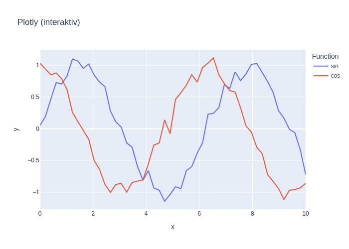 fig = px.line(df, x="x", y="y", color="Function", title="Plotly (interaktiv)")