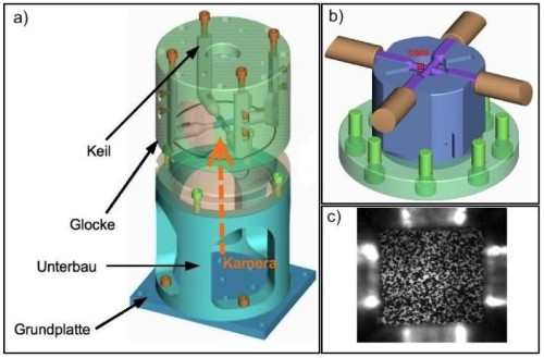 Abbildung: Aufbau der biaxialen Druckvorrichtung, die aus einem Unterbau und darüber befindlichen Glocke besteht. In dieser Glocke werden über die Keile die (b) applizierten Stempeln zur Kraftmessung bewegt und die (c) eingebaute Probe mit Speckle-Muster gestaucht (Aus: B. Zillmann, T. Halle, L.W. Meyer, T. Lampke: Experimentelle Bestimmung und Modellierung von Fließortkurven an Blechwerkstoffen unter Berücksichtigung des dritten Quadranten und der Dehnrate. Proc. Tagung Werkstoffprüfung, 2010, Neu-Ulm, Deutschland, 347-352).