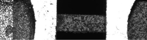 Abbildung: Eingespannte Minizugprobe mit Speckle-Muster für die Grauwertkorrelation mit dem ARAMIS-System von GOM. Die hier zu sehende Messlänge beträgt 5 mm.