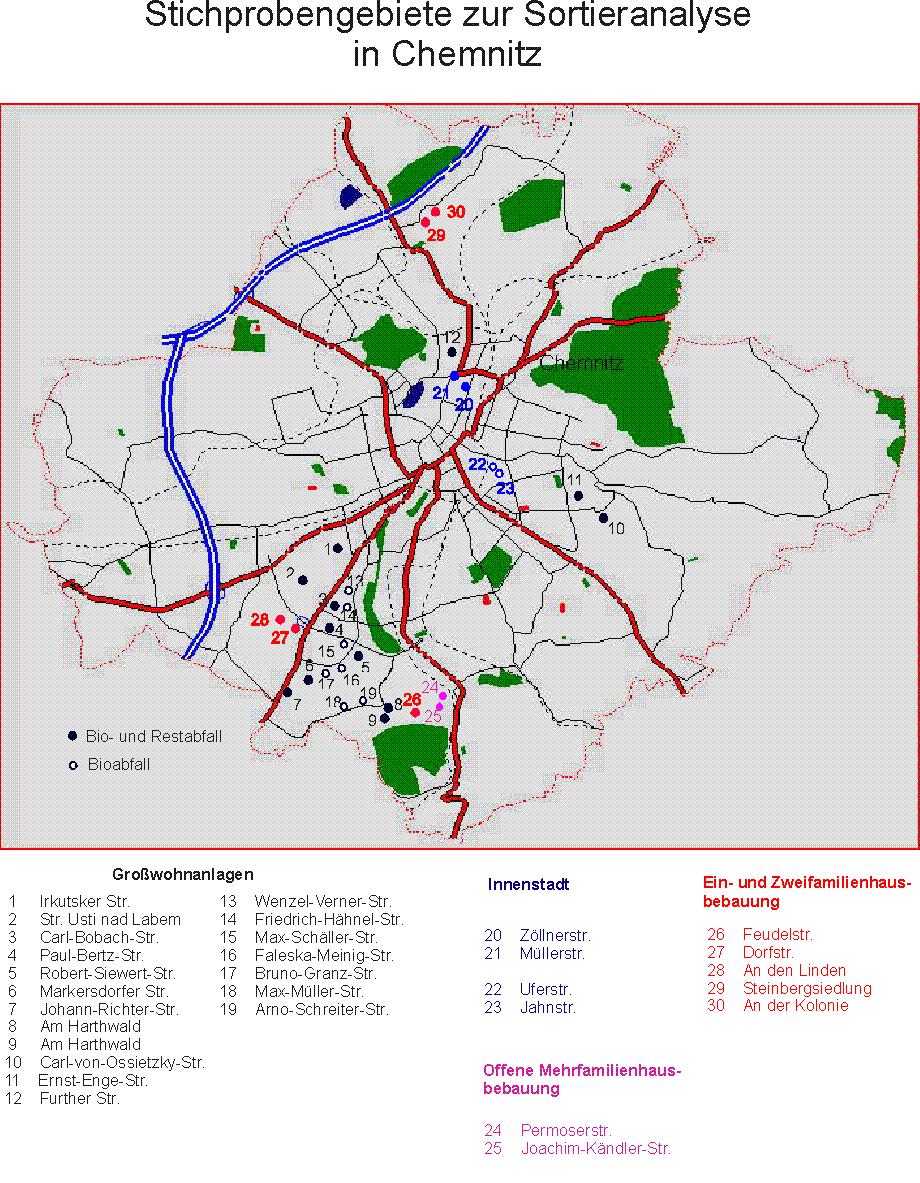 Für die Analyse, die im September 1997 erfolgte, wurden im Stadtgebiet von Chemnitz insgesamt 14 Stichprobengebiete in verschiedenen Siedlungsstrukturen ausgewählt: