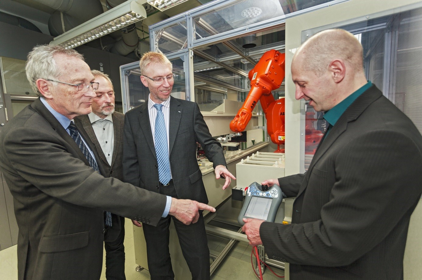 Nach den Vormittagsveranstaltungen wurden am ersten Tag in kleinen Gruppen praktische Versuche in den Laboren der Professur Oberflächentechnik / Funktionswerkstoffe durchgeführt. Die Analytik von Legierungsschichten mittels Röntgenfluoreszensanalyse (Fa. Hitachi) sowie die Badanalytik mittels Flüssigkeitschromatografie waren Bestandteil der praktischen Arbeiten. Die Beeinflussung der Legierungszusammensetzung mittels Pulsstrom konnten die Kursteilnehmer anhand einer Goldlegierungsabscheidung nachvollziehen. Ein besonderer Höhepunkt war die Vorstellung des neuen Galvanikroboters der Professur. Mit Hilfe dieses Automaten lassen sich Elektrolyte zeit- und kostensparend entwickeln.