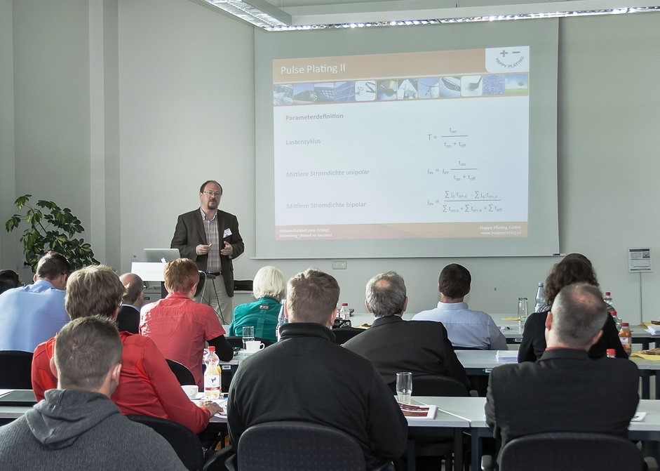 Der zweite Tag des Kurses startete mit Herrn Prof. Volker Bucher von der Hochschule Furtwangen. Er referierte über die Verträglichkeit von Metallen in medizinischen Anwendungen. Implantatwerkstoffe müssen eine Biokompatibilität mit dem Körper aufweisen. Hier bieten Legierungen ein weites Eigenschaftsspektrum. Für die Galvanotechnik bietet sich zudem ein weiteres Anwendungsfeld. Herr Mollath (ehemals Frauenhofer IPA, Berlin) beleuchtete die Parameteridentifikation bei der Legierungsabscheidung. Durch den komplexen Zusammenhang zwischen Elektrolyt- und Schichteigenschaften ist eine gezielte Suche nach den Haupteinflussfaktoren notwendig. Die hohe Parameteranzahl, auch im Zusammenhang mit Pulsstrom, erschwert diese Suche zusätzlich. Herr Mollath kam zu dem Schluss, dass die Anwendung von Kennfeldern für diese Problemstellung geeignet ist. Dadurch sind komplexe, mehrdimensionale Zusammenhänge nicht nur darstellbar, sondern können darüber hinaus mittels neuronaler Netze ausgewertet werden. Hierdurch können Schichtmerkmale wie Zusammensetzung und Glanz mit den Beschichtungsparametern (Metallgehalt, Stromdichte, ...) korreliert werden. Anschließend erläuterte Herr Dr. Hansal von Happy Plating den Kursteilnehmern die Vorteile der Pulsstromtechnik im Zusammenhang mit der Legierungsabscheidung.