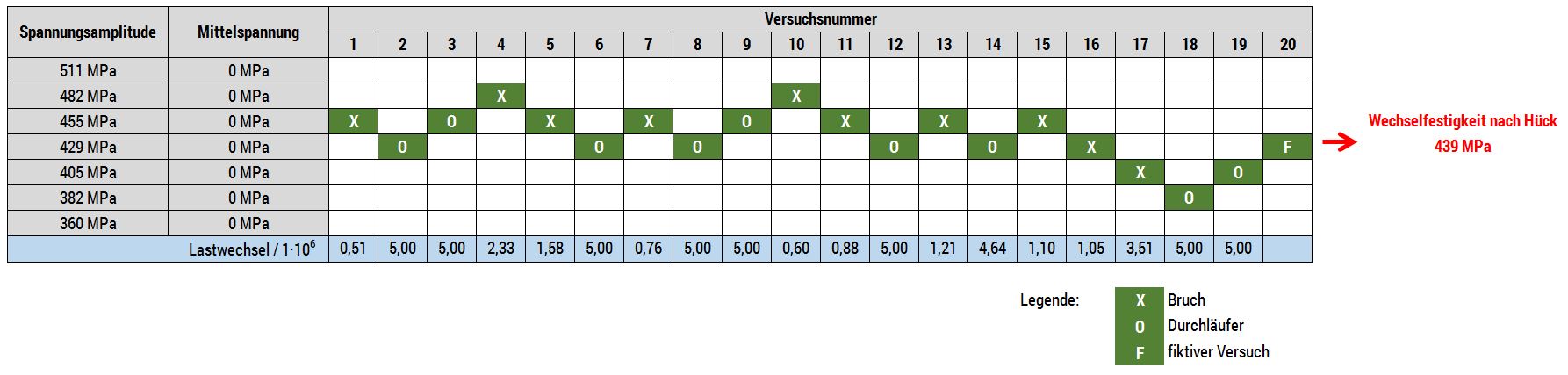 Je nach Zielstellung der Versuche kann die Zeit- oder Dauerfestigkeit der geprüften Werkstoffe bzw. Bauteile ermittelt werden. Abhängig von den aufgebrachten Spannungsamplituden und Mittelspannungen kommt es zu Brüchen im Zeitfestigkeitsbereich oder zu Durchläufern im Dauerfestigkeitsbereich, welcher durch die gewählte Grenzlastwechselzahl definiert wird und für Metalle i.d.R bei 5·106 Lastspielen liegt. Eine statistische Auswertung kann bei entsprechender Probenanzahl ebenfalls erfolgen. Aus den ermittelten Zeit- und Dauerfestigkeitswerten können Wöhlerkurven erstellt werden. Aus mehreren Wöhlerkurven, die bei verschiedenen Mittelspannungen ermittelt wurden, können wiederum vollständige Zeit- und Dauerfestigkeitsschaubilder gewonnen werden.