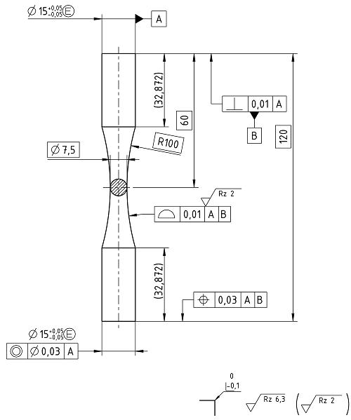 Aufgrund der zahlreichen Zielstellungen von Versuchen werden in DIN 50100 keine allgemein gültigen Probengeometrien angegeben, sondern nur zu berücksichtigende Anforderungen. Standardmäßig kommen an der Professur Maschinenelemente und Produktentwicklung Rundproben mit einem Prüfdurchmesser von 7,5 mm zum Einsatz. Aber auch andere Probekörper-Geometrien sind möglich.