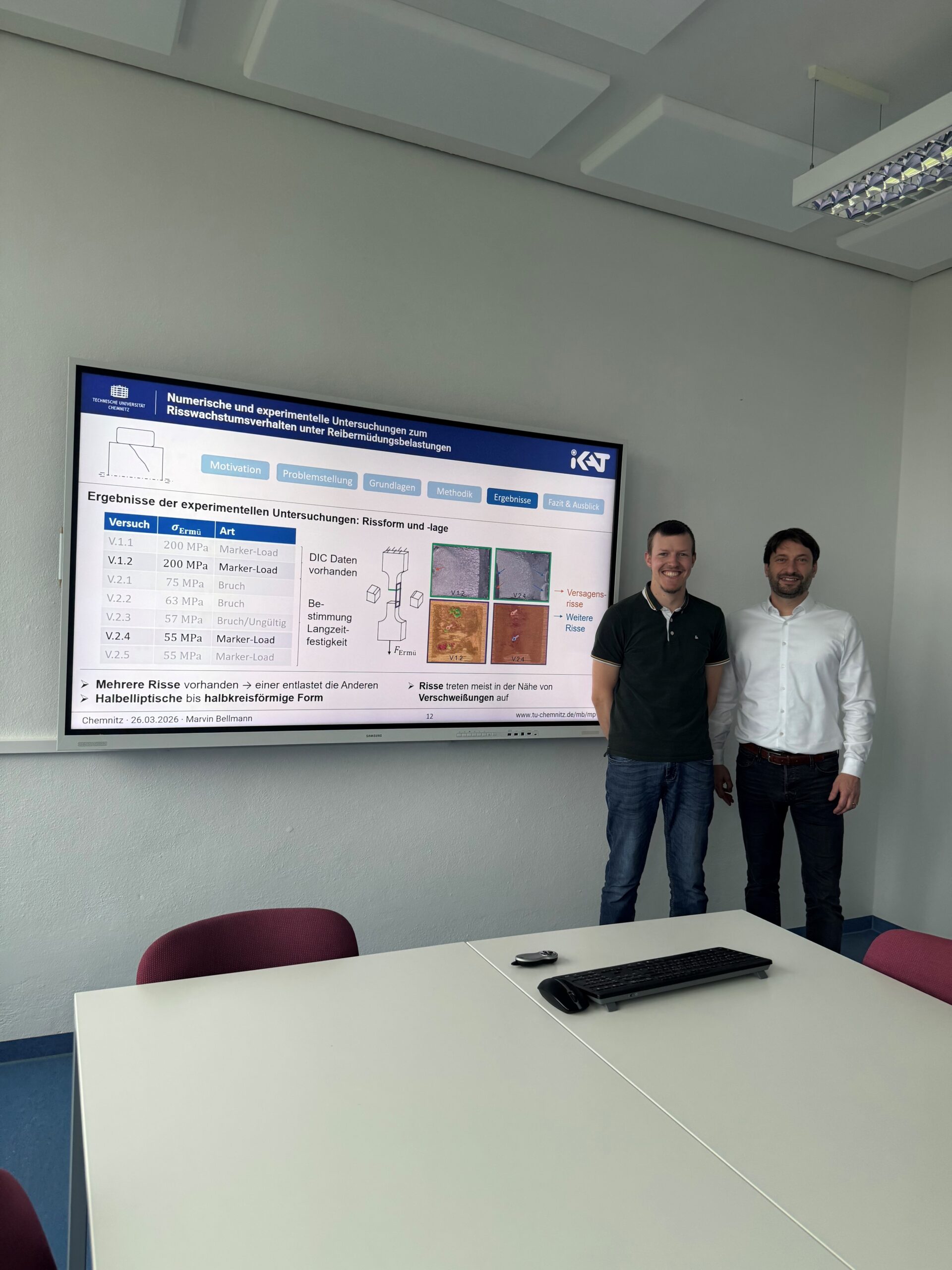 Herr Dipl.-Ing. Bellmann überzeugte mit einer herausragenden Diplomarbeit zum Thema „Numerische und experimentelle Untersuchungen zum Risswachstumsverhalten unter Reibermüdungsbelastung“ und trat zum 1. April seine Tätigkeit als wissenschaftlicher Mitarbeiter am IKAT an.