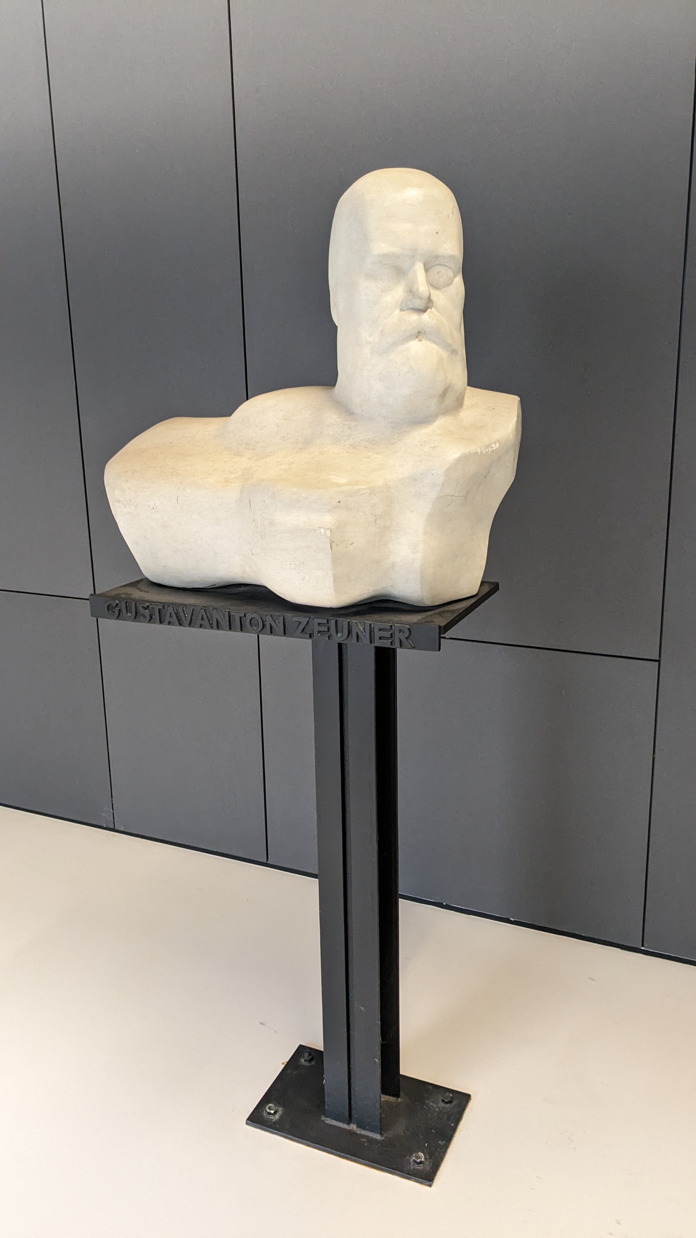 Der Plauener Künstler Rolf Magerkord fertigte die Porträtbüste von Gustav Anton Zeuner an. Der dargestellte Zeuner war von 1845 bis 1848 Schüler an der Königlichen Gewerbschule Chemnitz. Er erarbeitete später am Polytechnikum Dresden die Lehrbücher "Grundzüge der mechanischen Wärmetheorie", für die er bis heute als Mitbegründer der modernen Thermodynamik gilt.