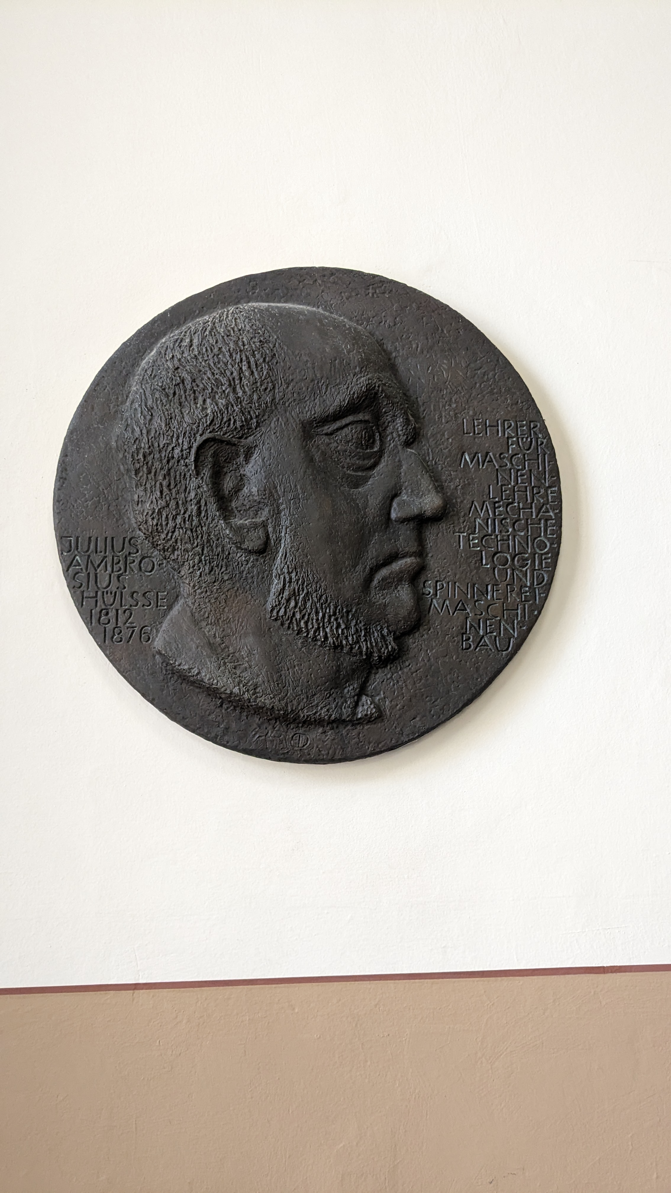 Der Chemnitzer Künstler Berthold Dietz fertigte das Medaillon mit dem Porträt von Julius Ambrosius Hülße an. Hülße war von 1841 bis 1850 Direktor der der Gewerbschule Chemnitz und unterrichtete Mechanische Technologie, Mechanik, Spinnereimechanik und Maschinenlehre.