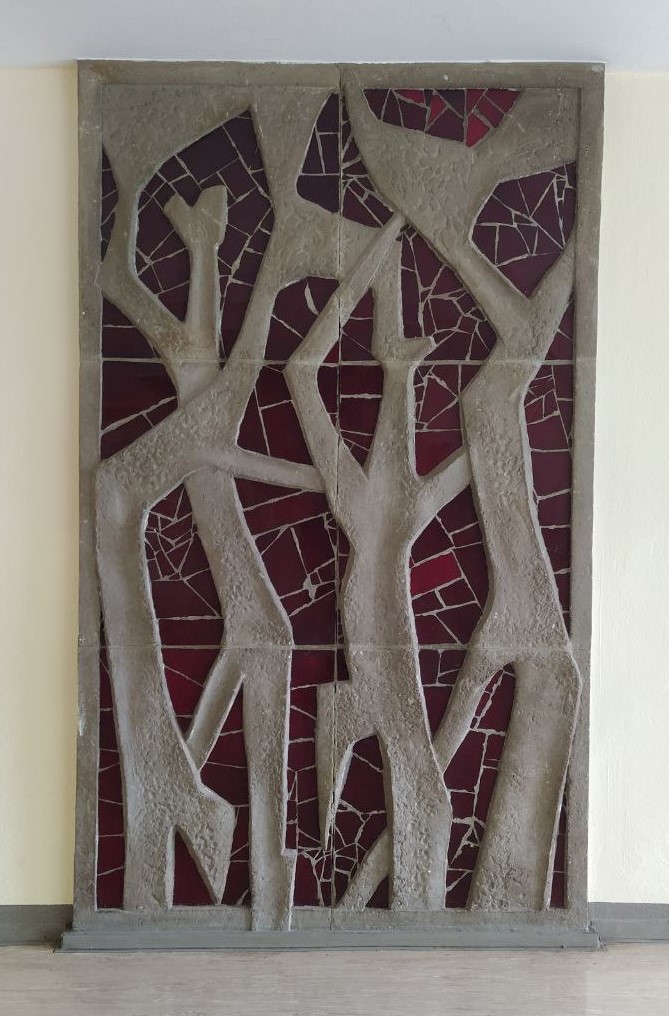Dafür schuf der Künstler Harald Stephan, der kurz zuvor sein Kunststudium in Dresden beendet hatte, 1967 diese abstrakte Wandgestaltung aus Betonglas und Beton. Er hatte die spezielle Ausführungstechnik für sein erstes Werk in Karl-Marx-Stadt selbst entwickelt. Laut dem Künstler wurden die Standorte für die Kunst seitens der Architekten vorgeschlagen. Er erinnerte sich, dass für das gesamte Projekt an der Hochschule viel Geld zur Verfügung stand und mehrere Künstlerkolleg*innen zusammengearbeitet haben. Der Auftrag wurde vom Büro für Bildende Kunst, bis zur Abnahme begleitet. Bei der Werksgestaltung wurden dem Künstler keine Vorgaben gemacht, er konnte frei arbeiten, selbst in einer abstrakten Gestaltung. Dies spiegelt die generelle Öffnung bezüglich der Stilrichtungen der Kunst in der DDR zu dieser Zeit wider.