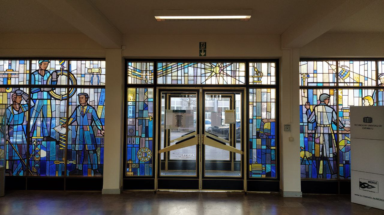 An der Reichenhainer Straße entstand um 1960 nicht nur der neue Campus. Weiter nördlich wurde an der Hausnummer 31-33 bis 1960 das repräsentative Verwaltungsgebäude der Vereinigung Volkseigener Betriebe (VVB) Wälzlager und Normteile errichtet. Das Bleiglasfenster des Künstlers Rudolf Fleischer, das die Rückseite des Foyers schmückt, stammt aus dem gleichen Jahr. Es wurde in der Glasmalerei K.Lange in Plauen (Vogtl.) ausgeführt und zeigt in zeittypischer Bildsprache die Zusammenarbeit von Forscher*innen und Industriearbeitern. Kleine Elemente wie Schrauben und Muttern weisen auf den ursprünglichen Auftraggeber hin. Das Glasbild steht ebenso wie das heute von der Universität genutzte Gebäude unter Denkmalschutz.