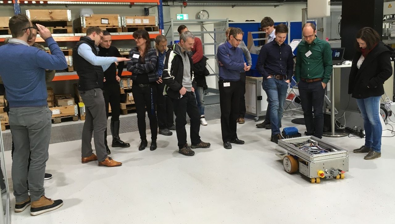 An der TU Chemnitz fand im Februar das abschließende öffentliche Projekttreffen statt. Zum Anfang wurden die Gäste und Projektbeteiligten mit aktuellen Statusvorträgen abgeholt. Anschließend wurde der neue Prototyp des fahrerlosen Transportfahrzeuges vorgestellt und dessen Funktionen wie die autonome Navigation und der Folgemodus mittels der 3D Kamera (SICK Visionary-T) in der Forschungsfabrik des Fraunhofer IWU präsentiert. Ebenso wurden alle Einzelkomponenten, das MCP, VICOS und das fahrerlose Transportfahrzeug miteinander gekoppelt und die Gesamtlösung getestet. Resultat war ein Funktionsnachweis, der eine, vom MCP vorgegebenen Fahrroute, welche vom FTF ausgeführt wurde und die Visualisierung des Ganzen in VICOS beinhaltete.