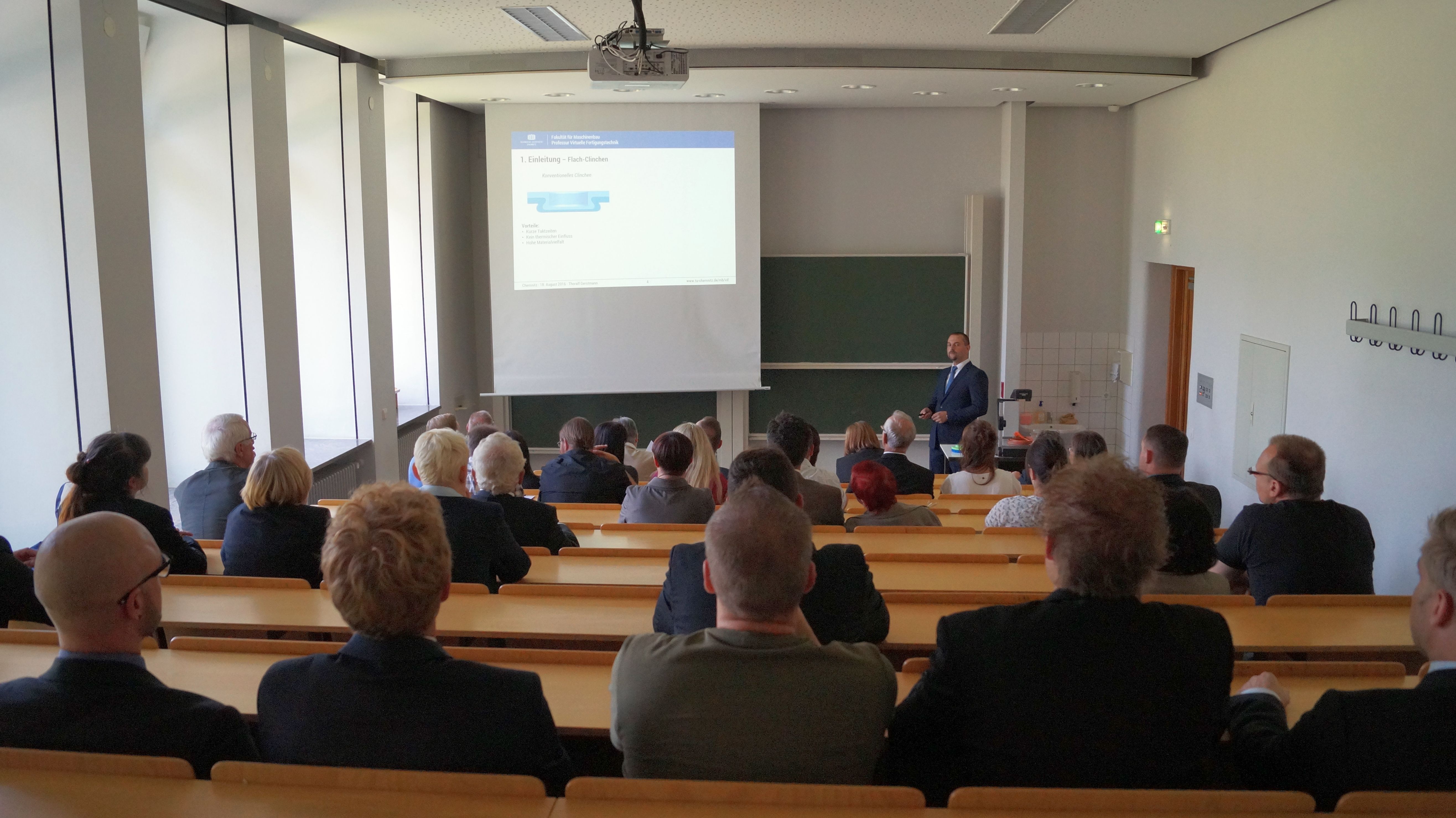 Am 07.02.2013 verteidigte Herr Sebastian Härtel erfolgreich seine Dissertation zum Thema "Experimentelle und numerische Untersuchungen zur Verfahrensentwicklung des Unrunddrückens". In seinem Vortrag glänzte er nicht nur mit Fachwissen, sondern schaffte es auch, unterstützt durch den Einsatz von greifbarem Anschauungsmaterial, die Thematik dem teils fachfremden Auditorium erfolgreich näher zu bringen.