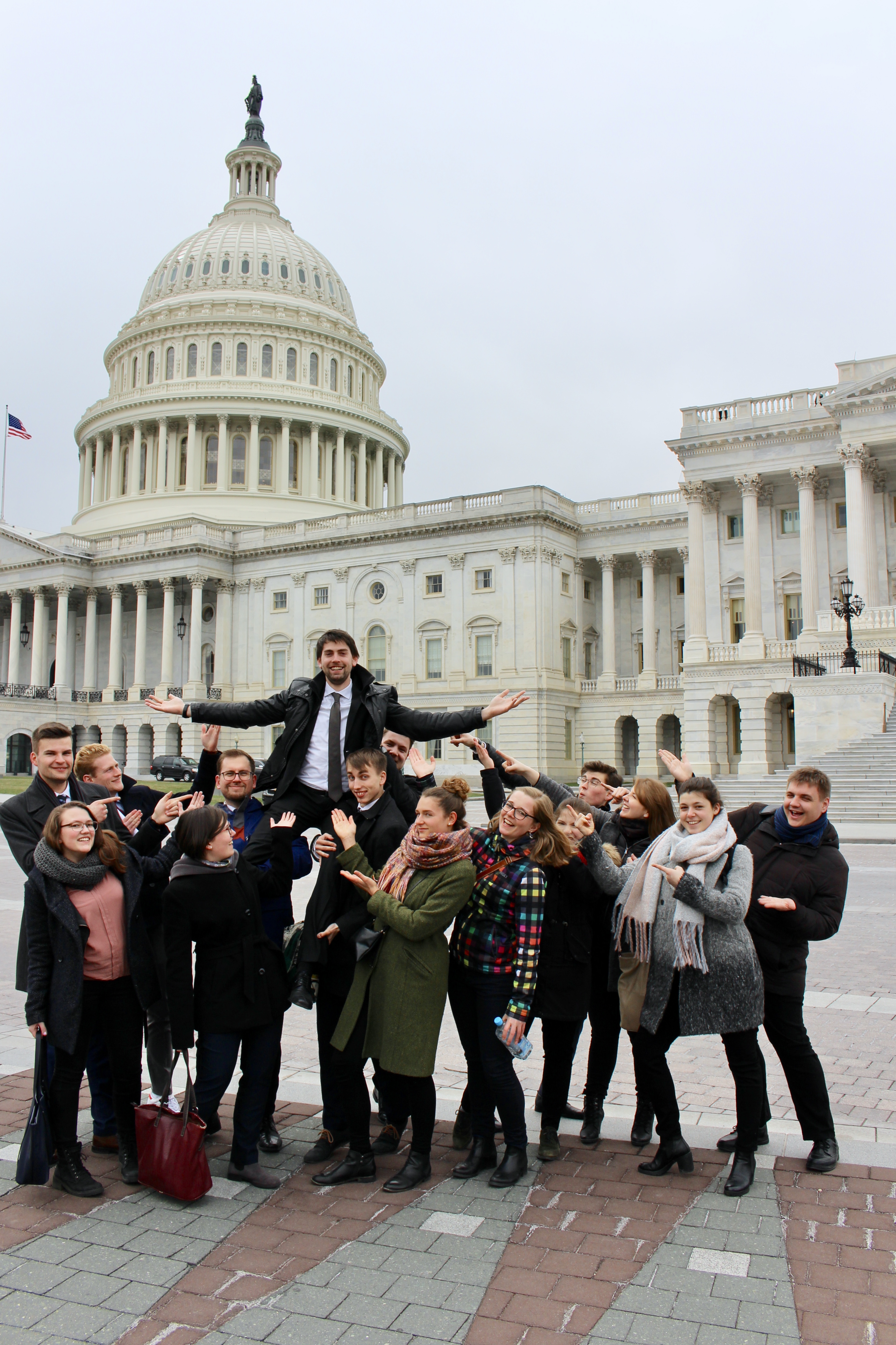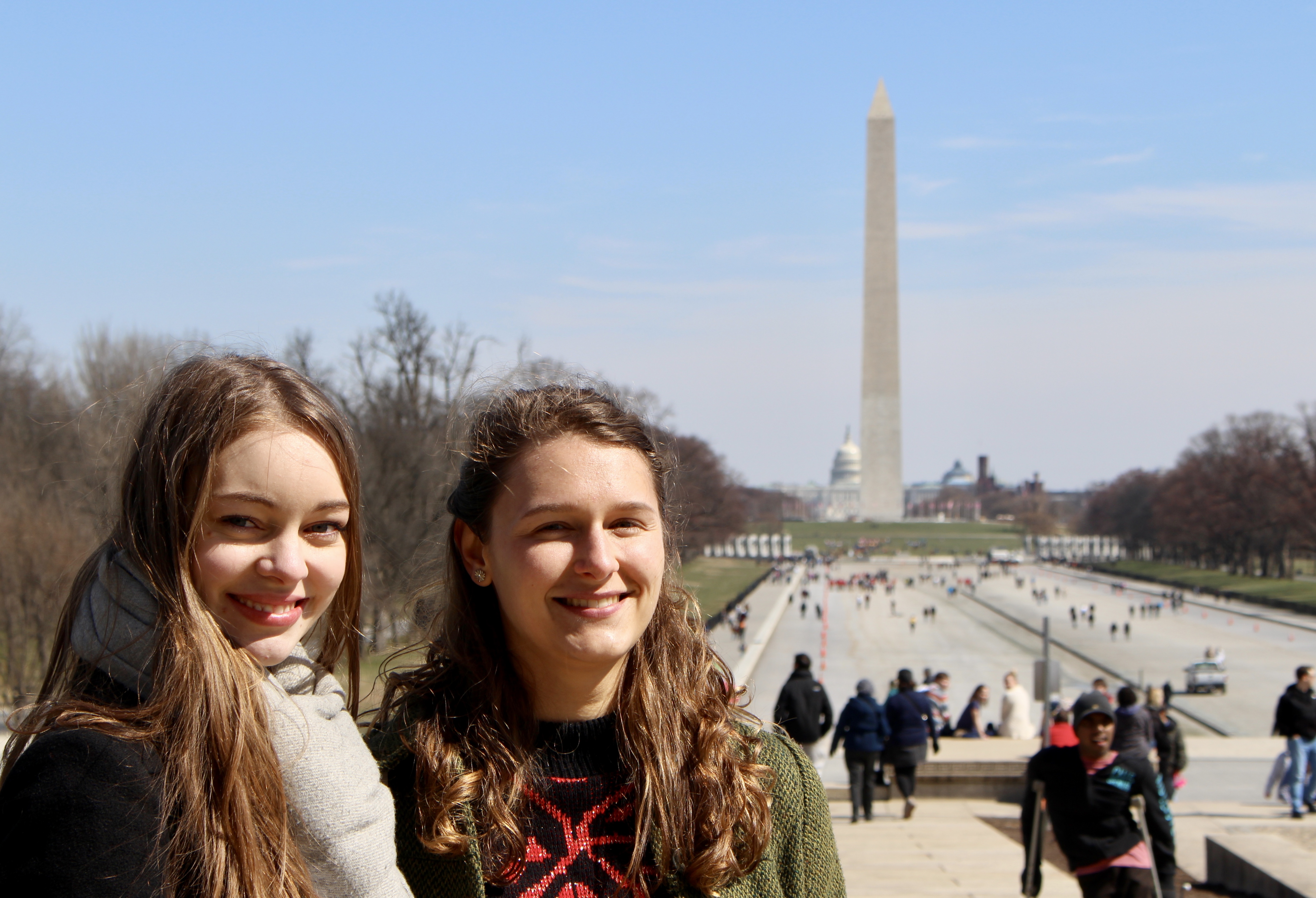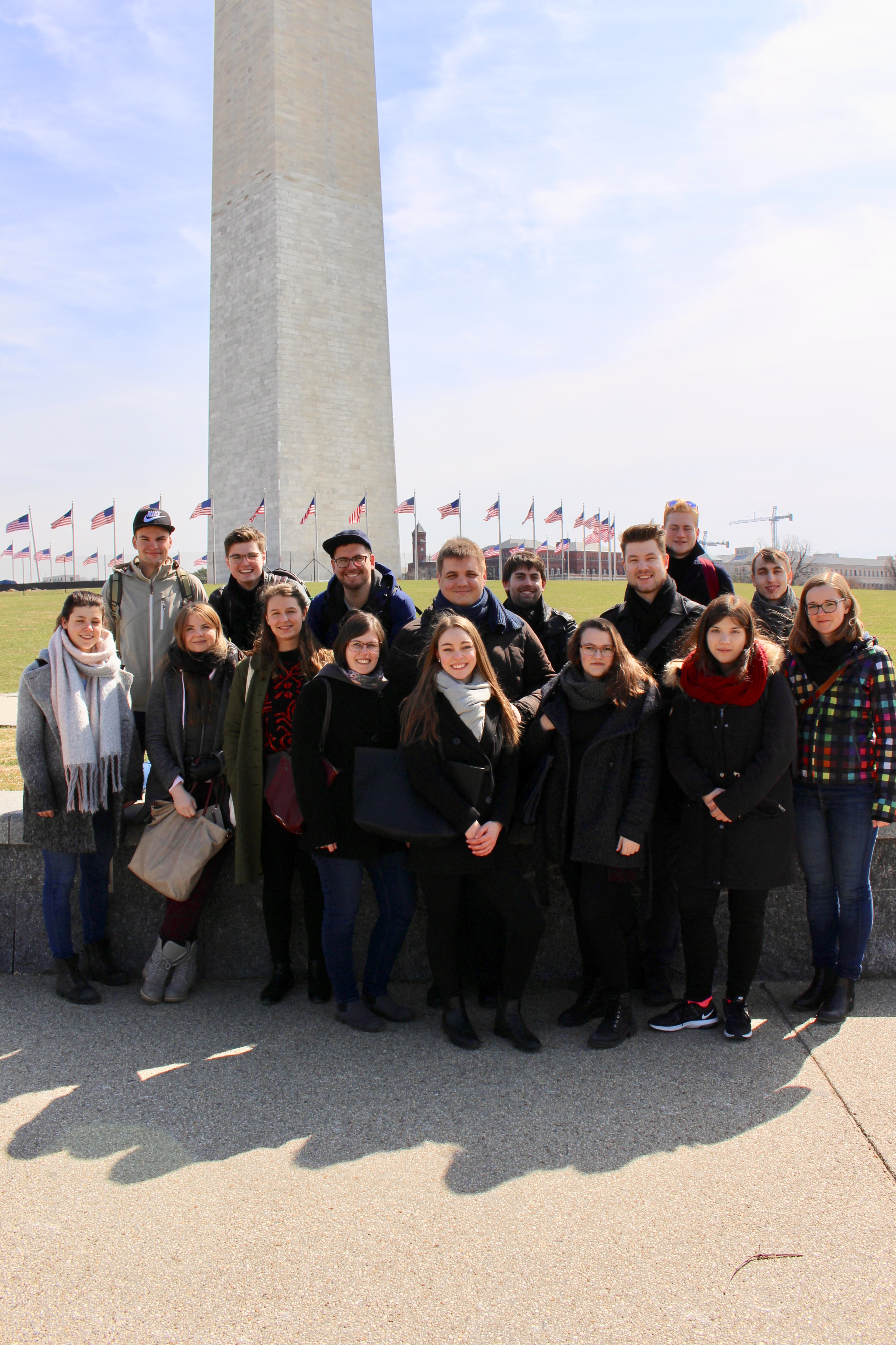 Neben der Erholung vom Jetleg hielt die Nacht einen Besucher bereit: Eine Maus machte sich am Gepäck unserer Delegates zu schaffen und stahl einen Muffin. Glücklicherweise hatten wir genug für das Frühstück eingekauft und stärkten uns für die Erkundung der US-amerikanischen Hauptstadt. Als wir die Metro-Station verließen, erwartete uns ein großer, festlicher Saint-Patrick’s-Day-Umzug. Leider wurde die geplante Stadtführung abgesagt, doch Jakob rettete den Tag und übernahm kurzentschlossen die Besichtigung der bedeutendsten Memorials der Stadt. Bei schönstem Sonnenschein und frühlingshaften Temperaturen begann unsere Route am Washington Monument, einem 169 Meter großen Obelisken, und führte uns vorbei an verschiedenen Kriegsgedenkstätten wie für den Vietnam-, Korea- und den Zweiten Weltkrieg. Den Höhepunkt bildete der atemberaubende Ausblick von den Stufen des Lincoln Memorials über die National Mall zum Kapitol. Nicht zuletzt atmeten wir den Geist der Freiheitsgeschichte am Denkmal des Bürgerrechtlers, Martin Luther King, ein.