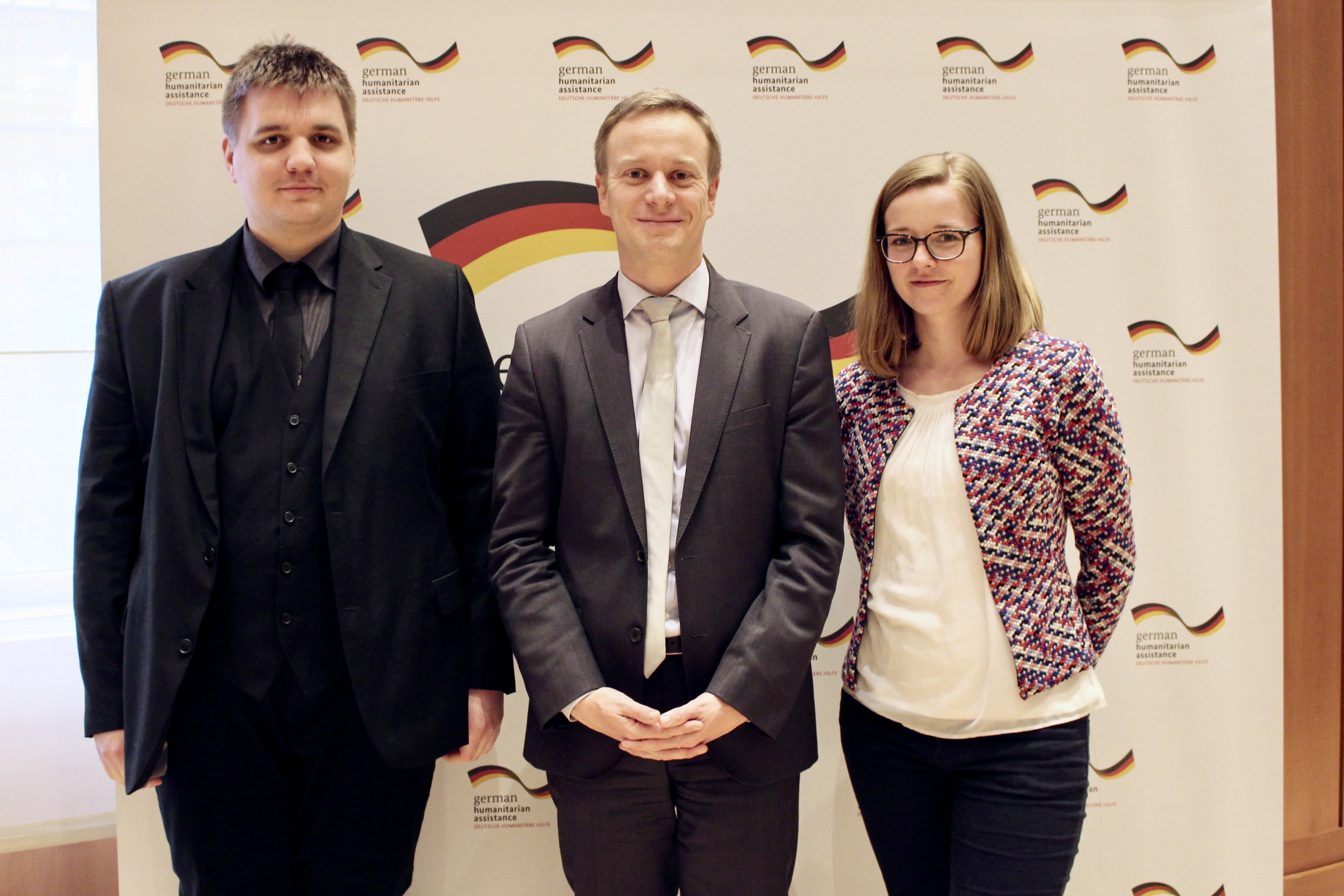 (Thomas (l.), Herr Haessler (m.) und Sarah (r.) bem Treffen in der Deutschen Vertretung)