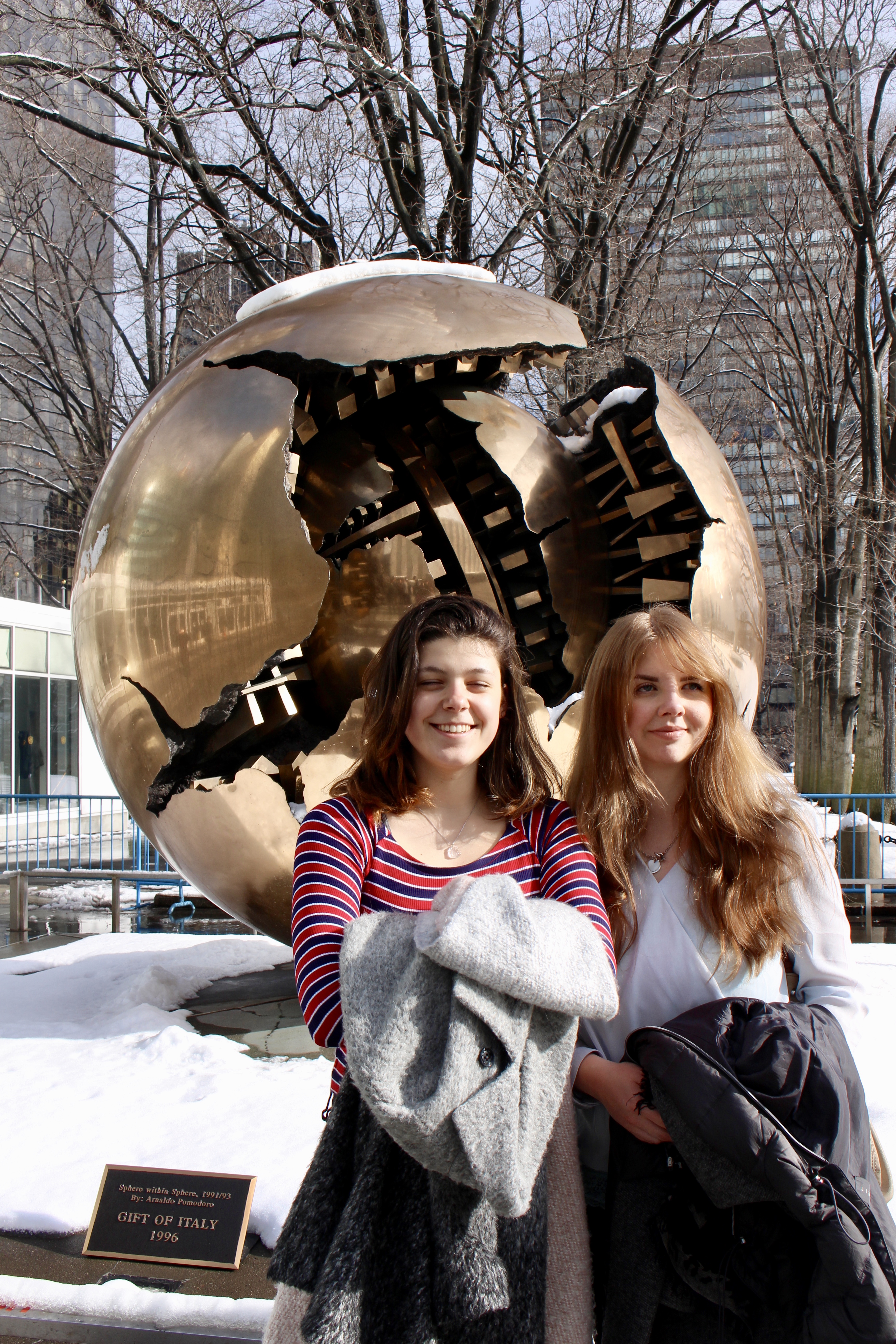 eine der besten Unis. Nach einer kreativen Fotosession zelebrierten wir diese Erfolge gemütlich zusammengequetscht in einem nicht für 16 Leute ausgelegten Hotelzimmer mit deliziösen Donuts und Kaffee. Später widmeten sich die einen bereits dem Kofferpacken, die anderen nutzten die freien Stunden, um auch das noch übrig gebliebene Bargeld am Times Square loszuwerden (bzw. ihre Schulden zu vertiefen) oder ein letztes Mal durch den Central Park zu spazieren. Im Rockefeller Center wurde mit der gesamten Delegation bei einem phänomenalen Ausblick über das im Sonnenuntergang rot getünchte New York angestoßen. Den krönenden Abschluss des Tages – und der Konferenz – bildete der „Delegates Ball“, bei welchem wir die Konferenz mit unserer Delegation sowie auch mit geknüpften internationalen Kontakten würdig verabschieden konnten. Die Stimmung in der Gruppe ist noch sehr fröhlich und glücklich, auch wenn der ein oder andere schon sentimental auf den morgigen Abreisetag blickt. (Fotos privat: Sophie (l.) und Xenia (r.) vor dem berühten Kunstwerk "Sphäre in einer Kugel" von Arnaldo Pomodoro)