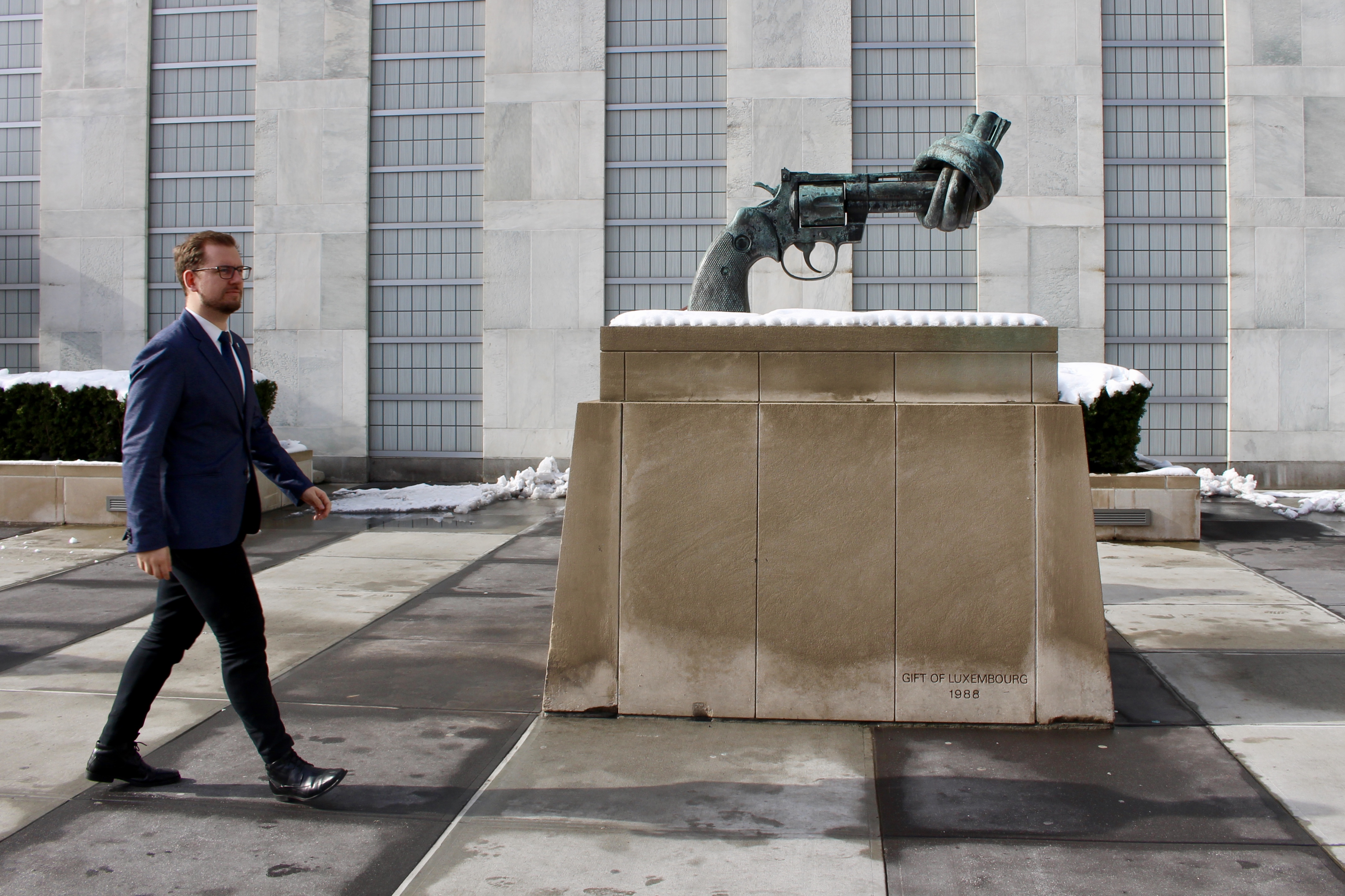 In den beiden Zimmern stapelten sich Gepäck und Delegierte gleichermaßen bei dem Versuch, ein entsprechendes Outfit für den folgenden Termin bei der Permanent Mission of the Federal Republic of Germany to the United Nations zu finden. Angekommen beim „Deutschen Haus“ trafen wir auch direkt auf Delegationen der Unis Regensburg und Bayreuth, die bei der UN-Simulation nächste Woche die Bahamas und das UK vertreten. Wir alle hatten ein gemeinsames Gespräch mit Conrad Haessler, dem Pressesprecher der Deutschen Vertretung bei den Vereinten Nationen in New York. Inhaltlich drehte sich die Diskussion hauptsächlich um die Bewerbung Deutschlands für einen Sitz im Sicherheitsrat für die Jahre 2019/20, aktuelle politische Ereignisse wie z. B. die zögerliche Regierungsbildung in Deutschland, den Brexit und die Beziehungen der Bundesrepublik zu Russland. Dieser Termin ermöglichte uns einen Einblick in die Arbeit Deutschlands bei den Vereinten Nationen, was insbesondere mit Blick auf die kommende