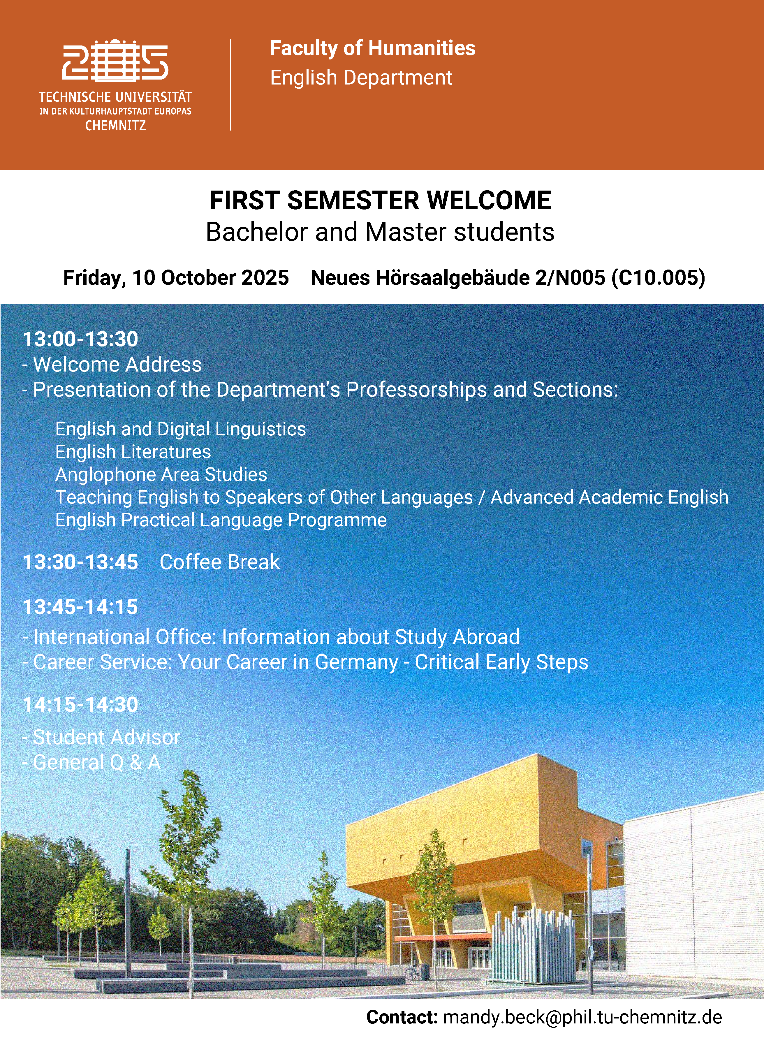 The TUC English Studies department welcomes all its first-year BA and MA students and cordially invites them to attend this year's First Semester Welcome on October 10th, 2025 in Neues Hörsaalgebäude, 2/N005! The event begins at 1 pm.