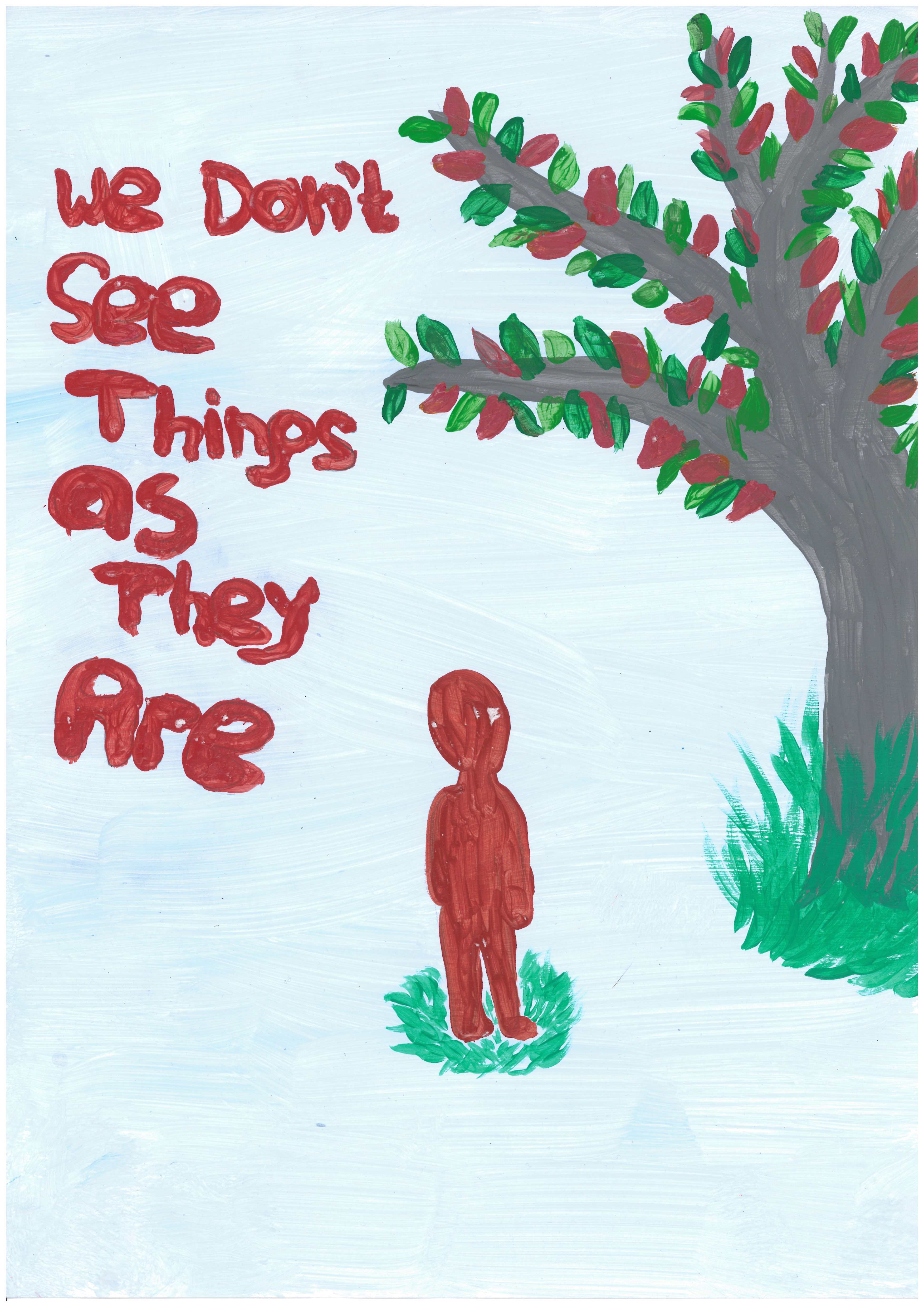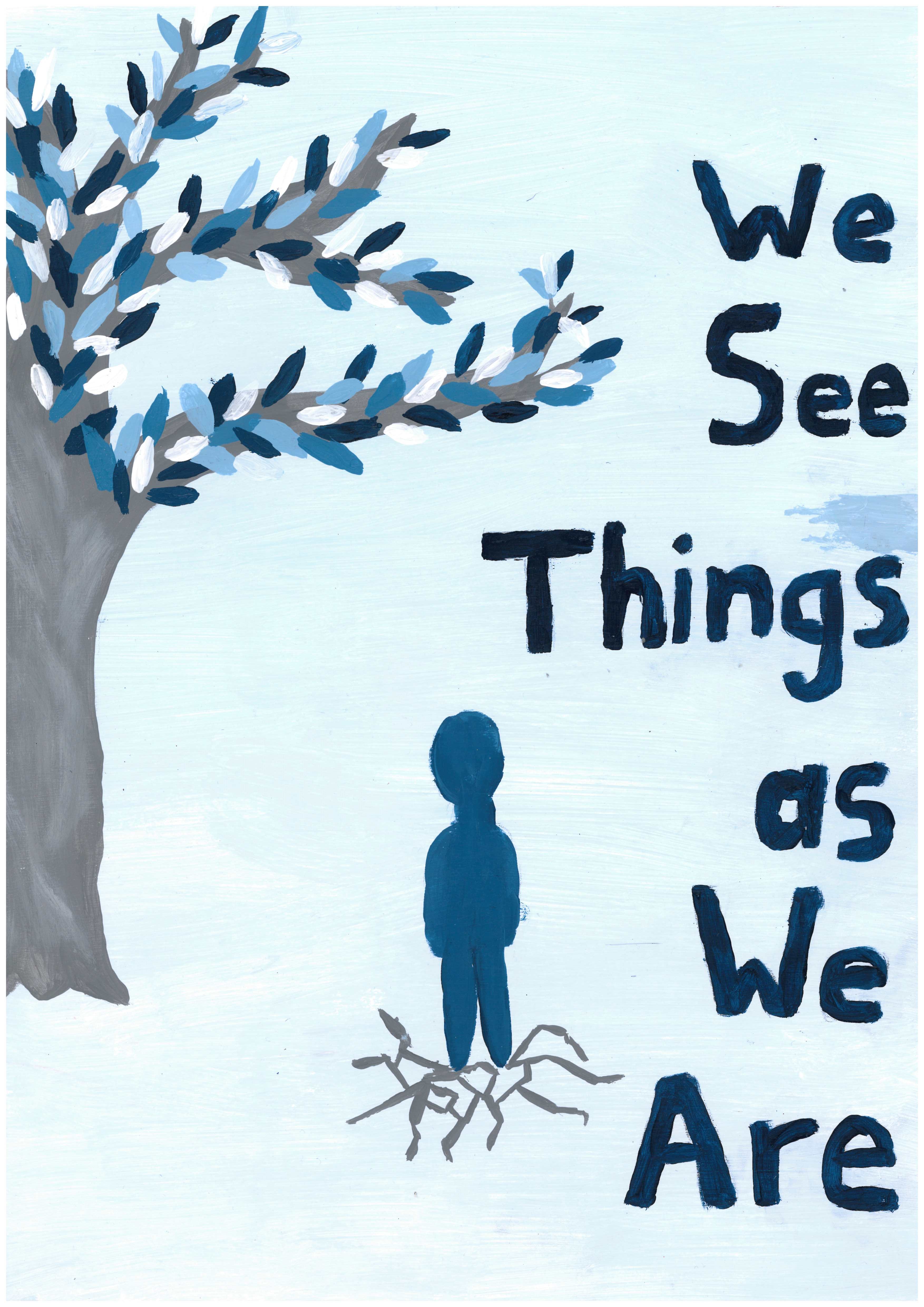 Das zweiteilige Werk thematisiert die Subjektivität der Wahrnehmung. „Wir sehen die Dinge nicht wie sie sind, wir sehen sie wie wir sind“ bezieht sich auf unsere Wahrnehmung der Welt, aus unserer eigenen Sichtweise. Durch die Gegenüberstellung der zwei Figuren unter einem in zwei geteilten Baum wird verdeutlicht, dass unsere innere Haltung, sowie Erfahrungen und Prägungen den Blick auf die Realität formen können. Die kontrastreichen Farbflächen, auf der einen Seite in starken und warmen Tönen und auf der anderen Seite in kühlen und dunklen Tönen, stehen für die Spannung zwischen dem Sichtbaren und dem inneren Empfinden. So verweist die Arbeit auf die zentrale Aussage des Zitats: Wirklichkeit zeigt sich nie als neutrale Gegebenheit, sondern stets in der Spiegelung des eigenen Selbst.