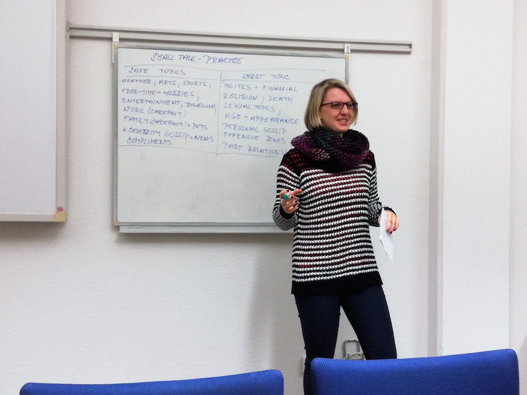 Three students took turns to teach a refresher course for professionals seeking to improve their speaking skills. Barbora Průšová, an Erasmus student from the University of West Bohemia in the Czech Republic was the first to take the helm. "From the outset, I worked to establish a positive and safe atmosphere so that the participants would be comfortable expressing themselves, since the aim was for them to improve their speaking skills. Their level was in the A2 - B1 range of the Common European Framework of Reference for Languages whereby the language learner can talk coherently about familiar topics pertaining to work and leisure."