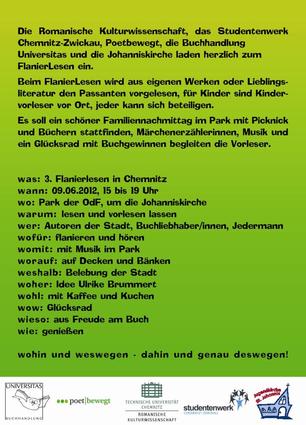 Zum dritten Mal laden wir alle, die nicht genug davon bekommen können, zum FlanierLesen ein. Wir, das sind in diesem Jahr die Romanische Kulturwissenschaft der TU Chemnitz, das Studentenwerk Chemnitz-Zwickau, poetbewegt Wettbewerb für junge Literatur, die Universitas Buchhandlung und die Johanniskirche.