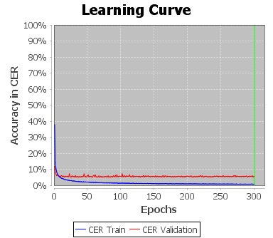 Gegenüberstellung der anfänglichen Lernkurve (Frühjahr 2022) auf der linken Seite und einem aktuellen Ergebnis (Anfang 2023) auf der rechten Seite. (X-Achse: Anzahl der Epochen - Gibt an, wie oft die Trainingsdaten ausgewertet wurden; Y-Achse: Character Error Rate - Vergleich der Gesamtzahl der Zeichen die erforderlich sind, um das Ergebnis der Grundwahrheit zu erhalten. Selbst kleinste Trankriptionsfehler, z.B. Leerzeichen oder Kommata, gelten hierbei als statistisch vollwertig.)