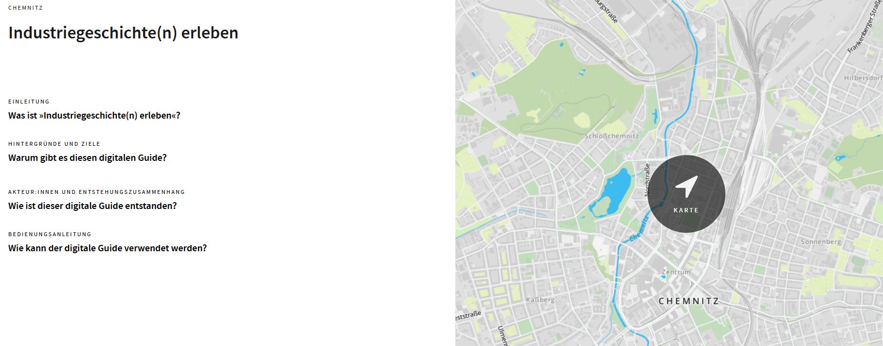 Der digitale Guide »Industriegeschichten(n) Erleben« führt Dich entlang verschiedener thematischer Routen tiefer in die industrielle Geschichte(n), Veränderungen und Gegenwarten von Chemnitz. Beginnend beim »sächsischen Manchester«, über die städtebaulichen und gesellschaftlichen Entwicklungen während des Sozialismus, die Veränderungen durch den Strukturwandel der 1990er Jahre bis hin zu Diskursen der heutigen Epoche kannst Du Chemnitz entdecken.