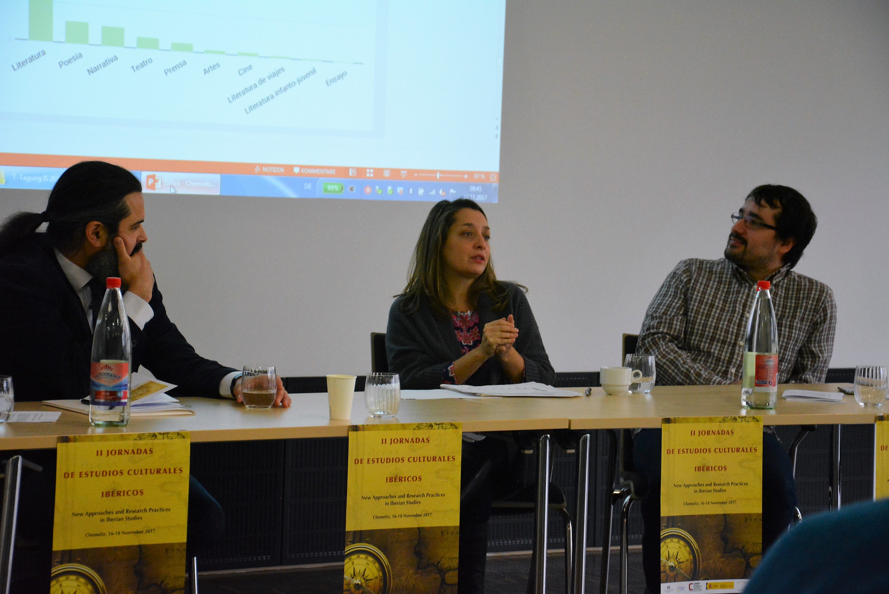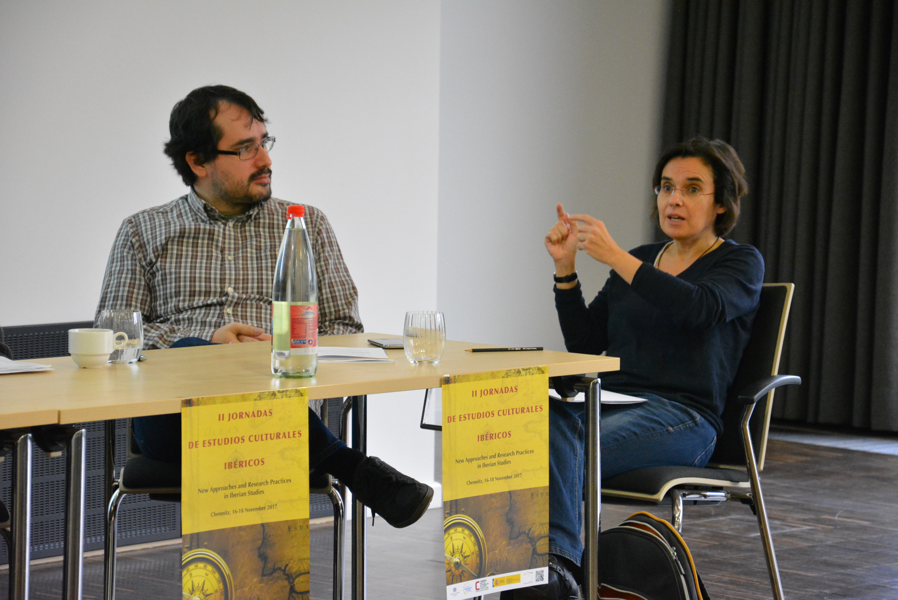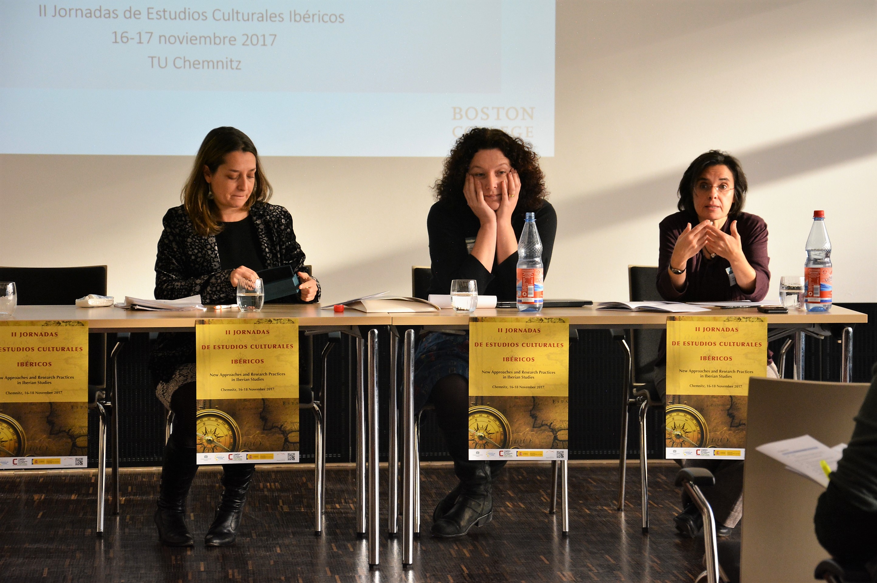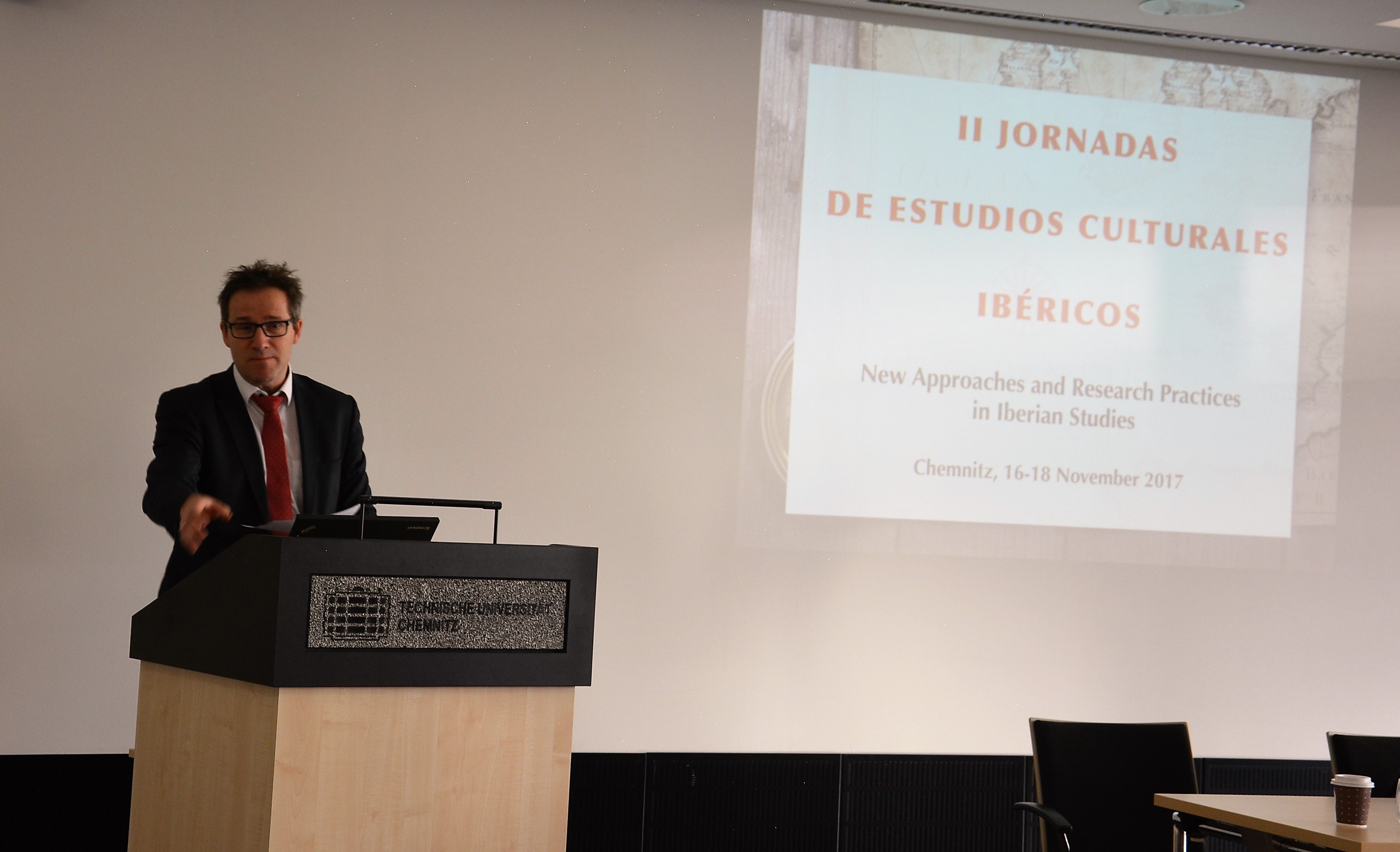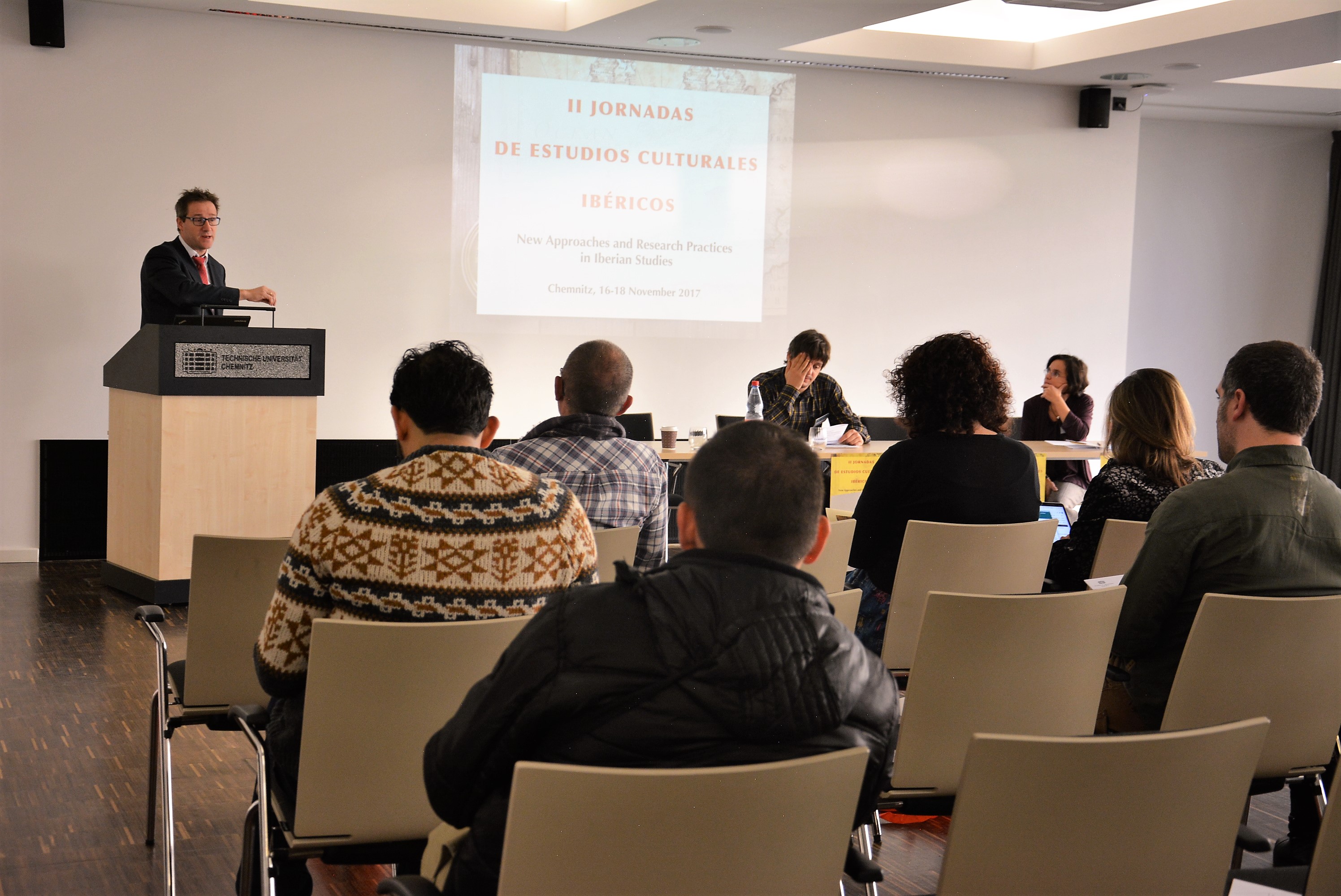 Unter dem Titel „New Approaches and Research Practices in Iberian Studies“ fanden vom 16. bis 18.11.2017 die II Jornadas de Estudios Culturales Ibéricos an der TU Chemnitz statt. Die Tagung wurde organisiert von Teresa Pinheiro, Inhaberin der Professur Kultureller und Sozialer Wandel. Gefördert wurde die Veranstaltung von Camões Instituto da Cooperação e da Língua Portugal, Ministerio de Educación, Cultura y Deporte del Gobierno de España, dem Deutschen Hispanistenverband und dem Institut für Europäische Studien. Mit der Fortsetzung der 2014 von Ulrich Winter an der Universität Marburg initiierten I Jornadas stellte die Tagung einen weiteren wichtigen Schritt zur Etablierung der noch jungen Forschungsrichtung der Iberischen Studien im deutschen Kontext dar. Bei der interdisziplinär und international besetzten Tagung zeigte sich eine große Diversität an Themen, Perspektiven und methodischen Forschungsansätzen. In insgesamt acht verschiedenen Sektionen präsentierten die Referent/innen aus Deutschland, Israel, Italien, Irland, Neuseeland, USA und der Iberischen Halbinsel neue Forschungsprojekte und diskutierten über mögliche Verknüpfungspunkte ihrer benachbarten Disziplinen aus den Sprach-, Kultur- und Sozialwissenschaften.