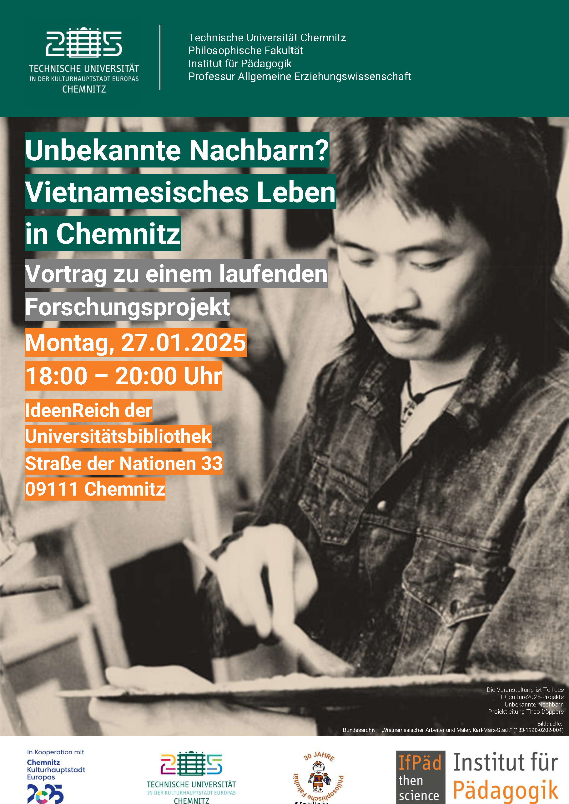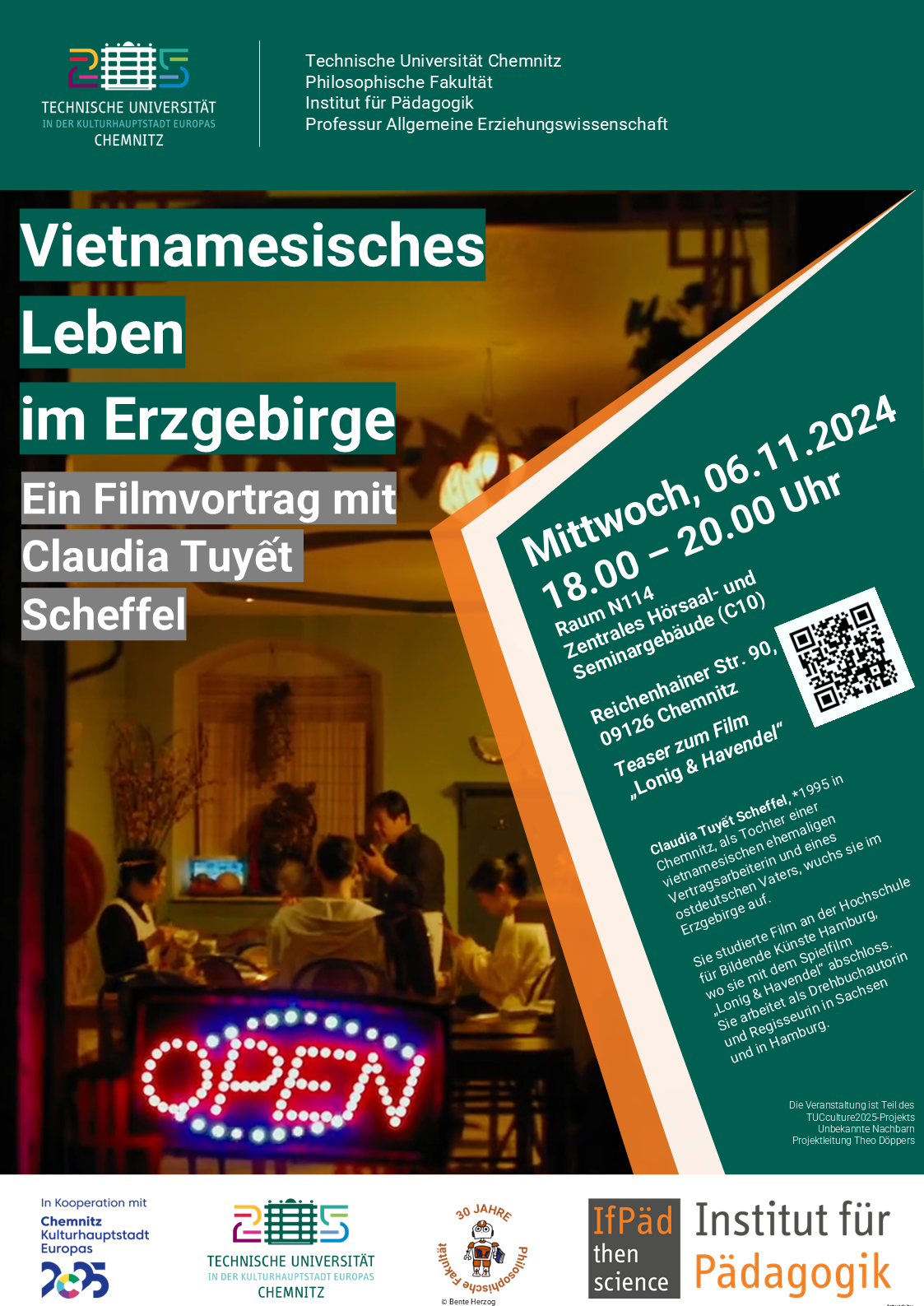Europa schaut auf Chemnitz als Kulturhauptstadt – aber wie blickt Chemnitz auf Europa? Das Projekt „Angesprochen Chemnitz – Ausgesprochen Europa!“ eröffnet eine Multiperspektive auf die Erfahrungen ehemaliger Schüler:innen, Lehrer:innen und Bildungspolitiker:innen, um zu zeigen, wie sich das schulisch vermittelte Europa seit der Wendezeit verändert hat. In Zusammenarbeit mit Kunstschaffenden und dem Chemnitzer Geschichtsverein werden Zeitzeug:inneninterviews illustriert und am 3. Dezember in der Universitätsbibliothek präsentiert. Ziel ist es, die Zusammenarbeit zwischen Wissenschaft und Chemnitzer Kulturschaffenden zu fördern und zur Aufarbeitung der (Post-)Wendezeit anzuregen.